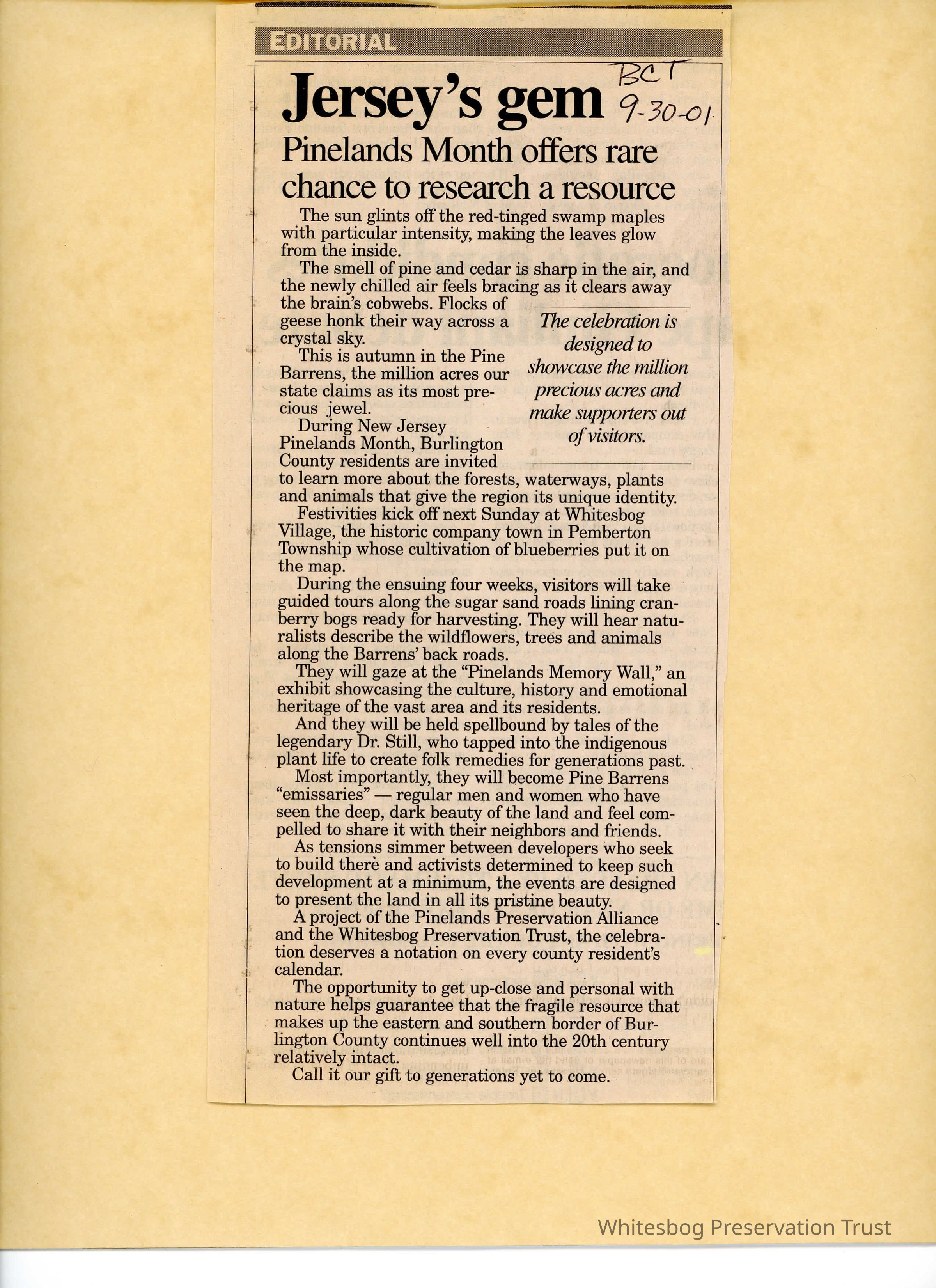An article about the festivities associated with the 2001 Pinelands Month, and the importance of getting into nature. Includes the quote, "Call it our gift to generations yet to come".