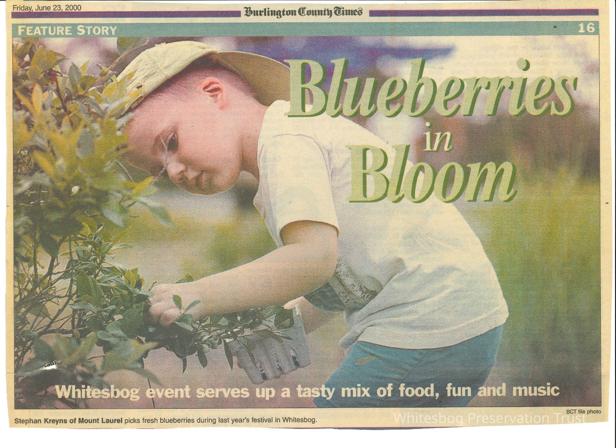 This is an article about the upcoming 2000 blueberry festival, and includes 4 pictures from the 1999 festival. The article makes note that there will be more guided tours available to visitors that year.