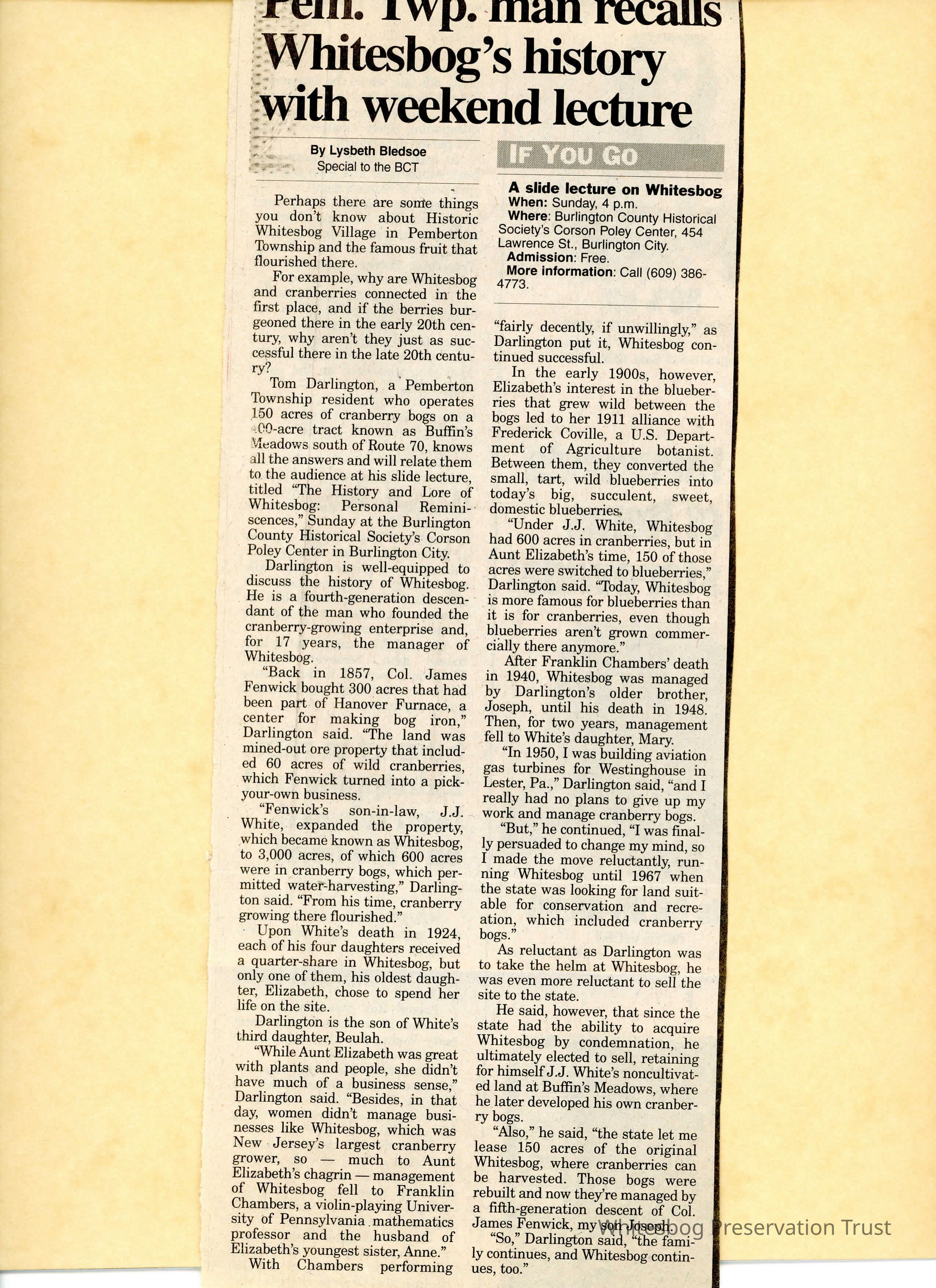 An article about a lecture that Tom Darlington gave at the Burlington County Historical Society's Corson Poley Center in Burlington City, called "The History and Lore of Whitesbog: Personal Reminiscences"