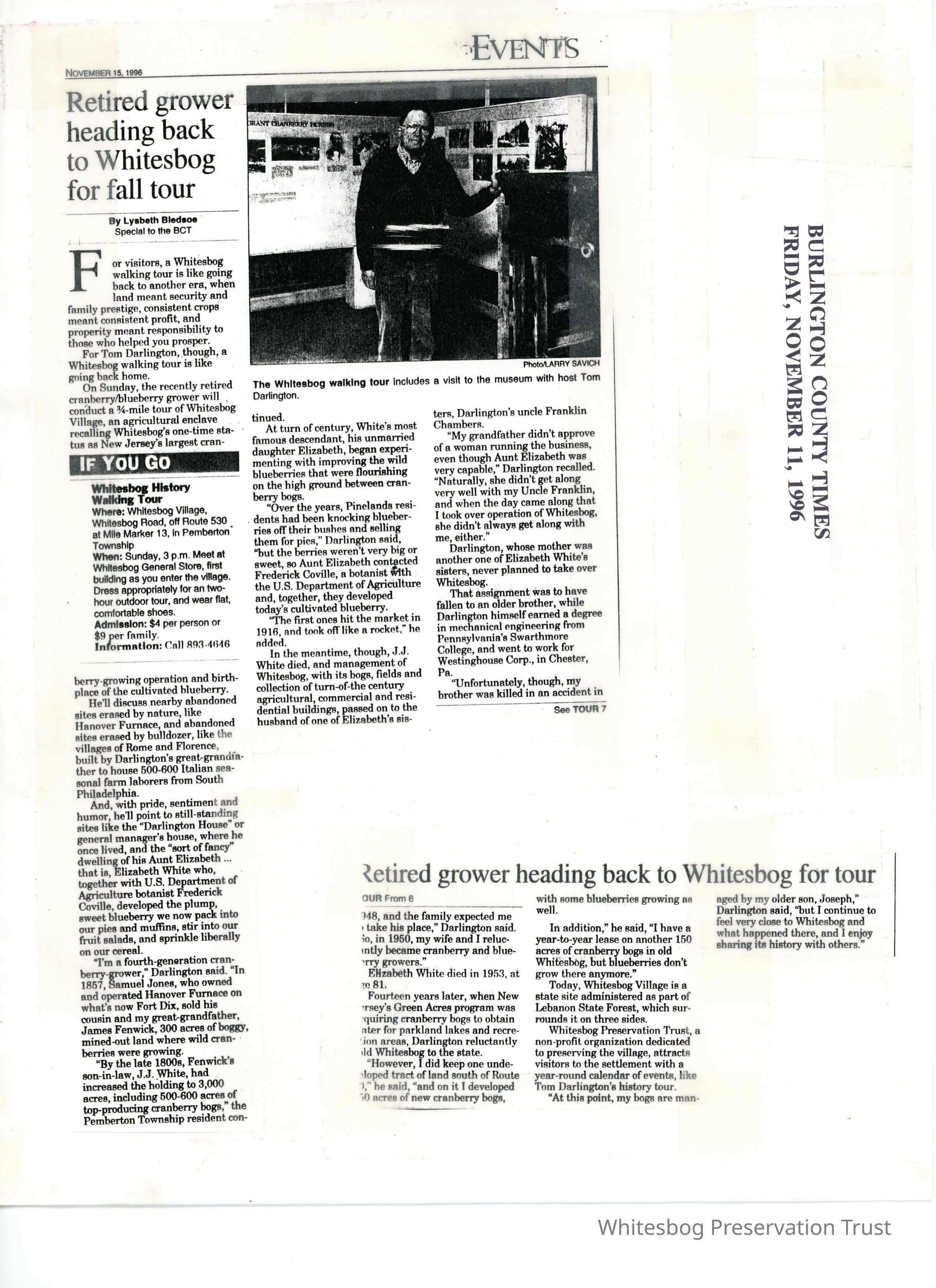 An article about Thomas Darlington, recently retired, and hosting a walking tour at Whitesbog. The article includes a brief history of the site.