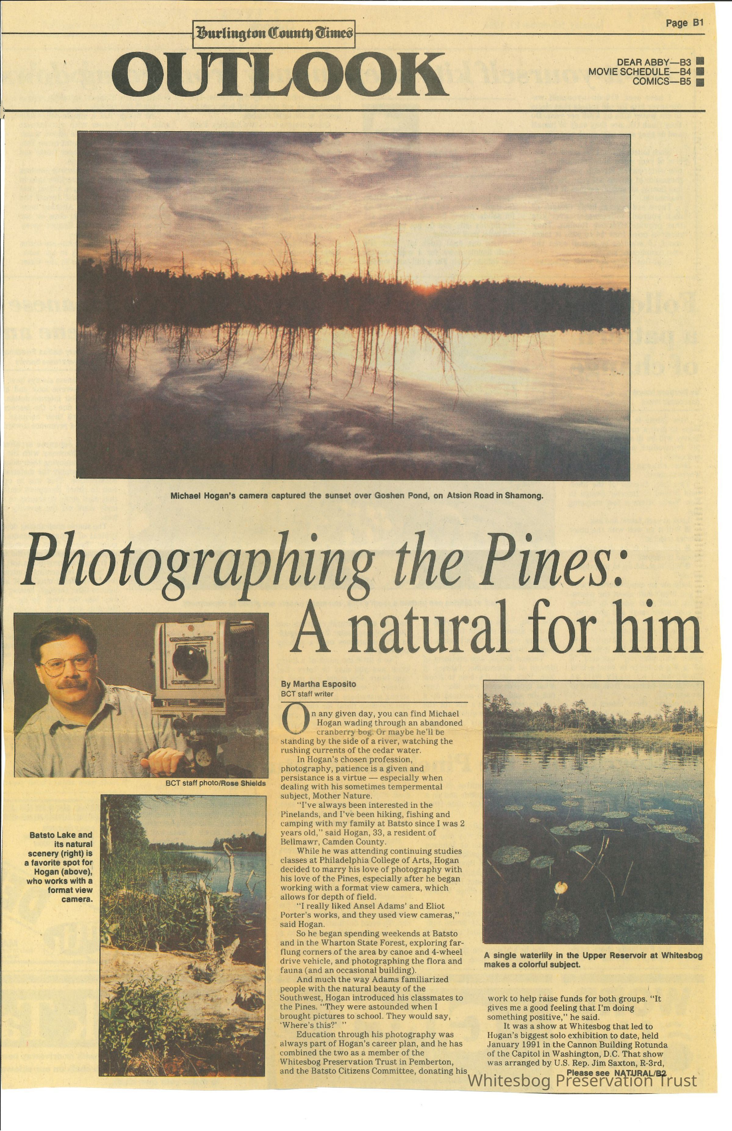 An article about photographer, Michael Hogan, a resident of Bellmawr in Camden County, and his pictures of the Pinelands area to include Whitesbog. The article highlights that his pictures were seen in exhibits in Camden, Trenton, and Washington DC.
