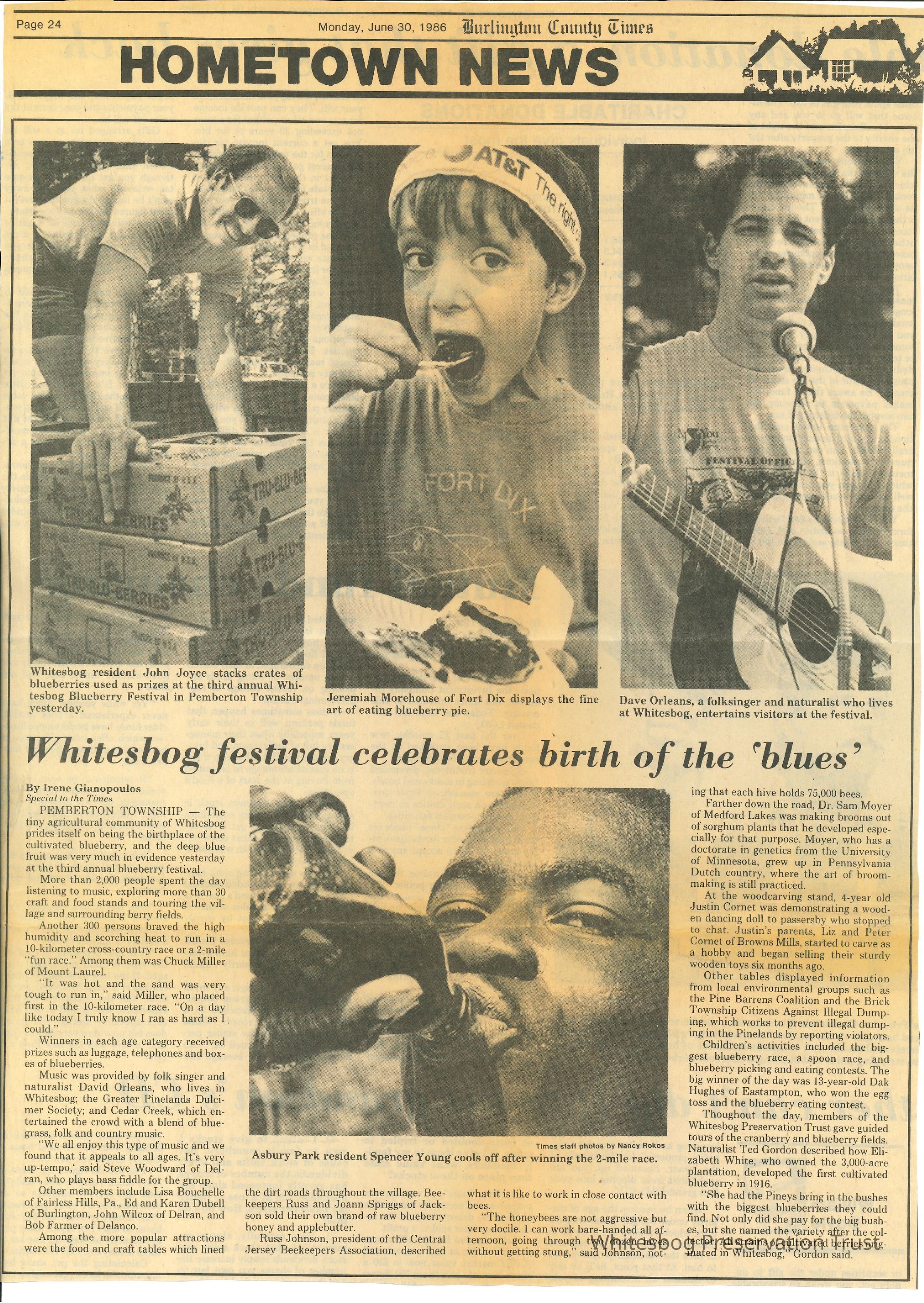 An article about the success of the 3rd annual blueberry festival in 1986. Events included a blueberry pie eating contest, spoon race, 10km cross country race and 2 mile "fun race". The article makes note that it was hot and humid.