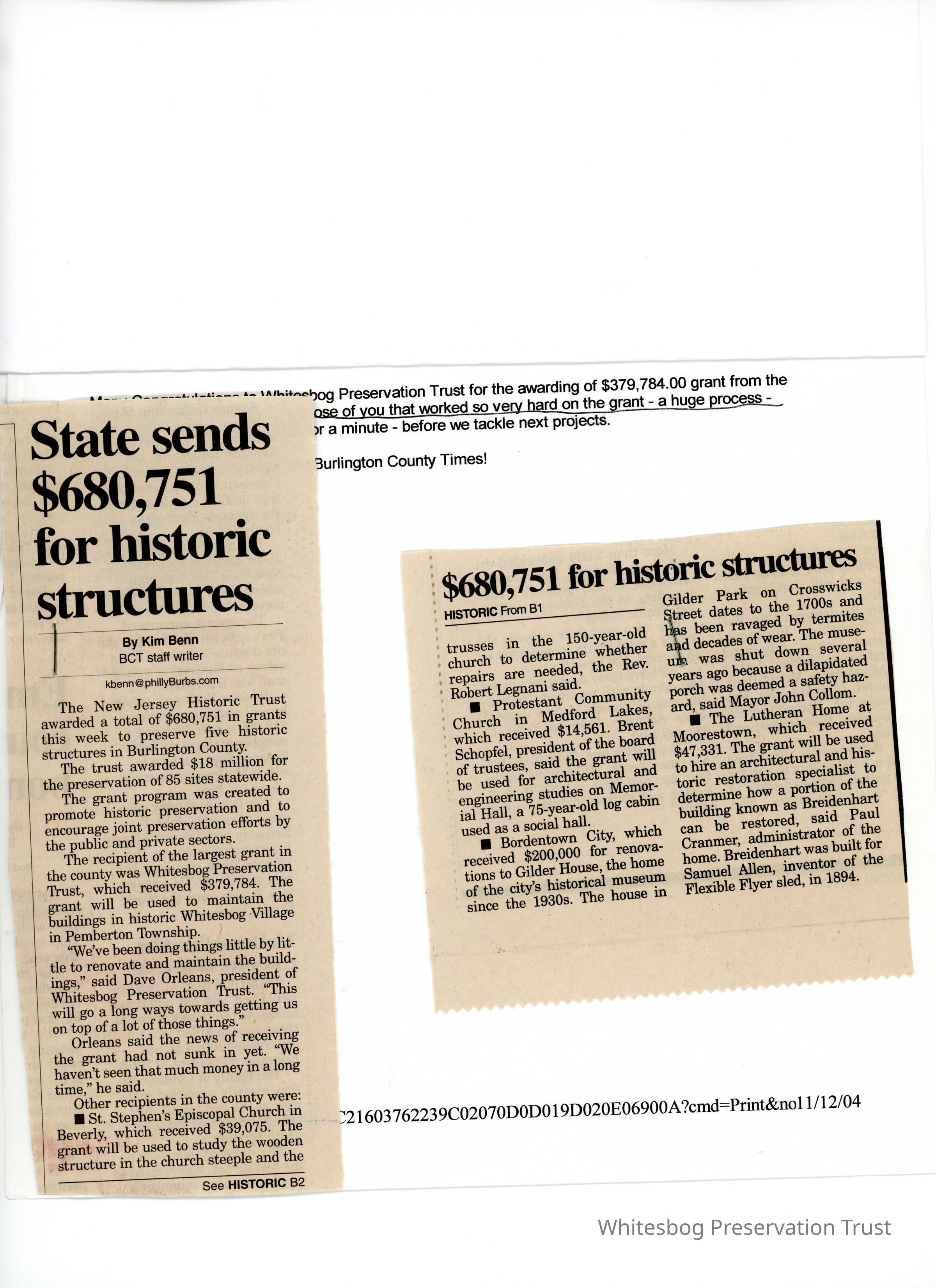 An article about the $680,751 awarded to Burlington County by the New Jersey Historic Trust of which, Whitesbog received $379,784.