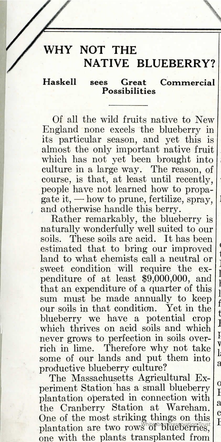 Talks about the Massachusetts Agricultural Experimentation Station's small blueberry plantation and the indicators that the commercial blueberry growing industry is about to begin in Mass.
