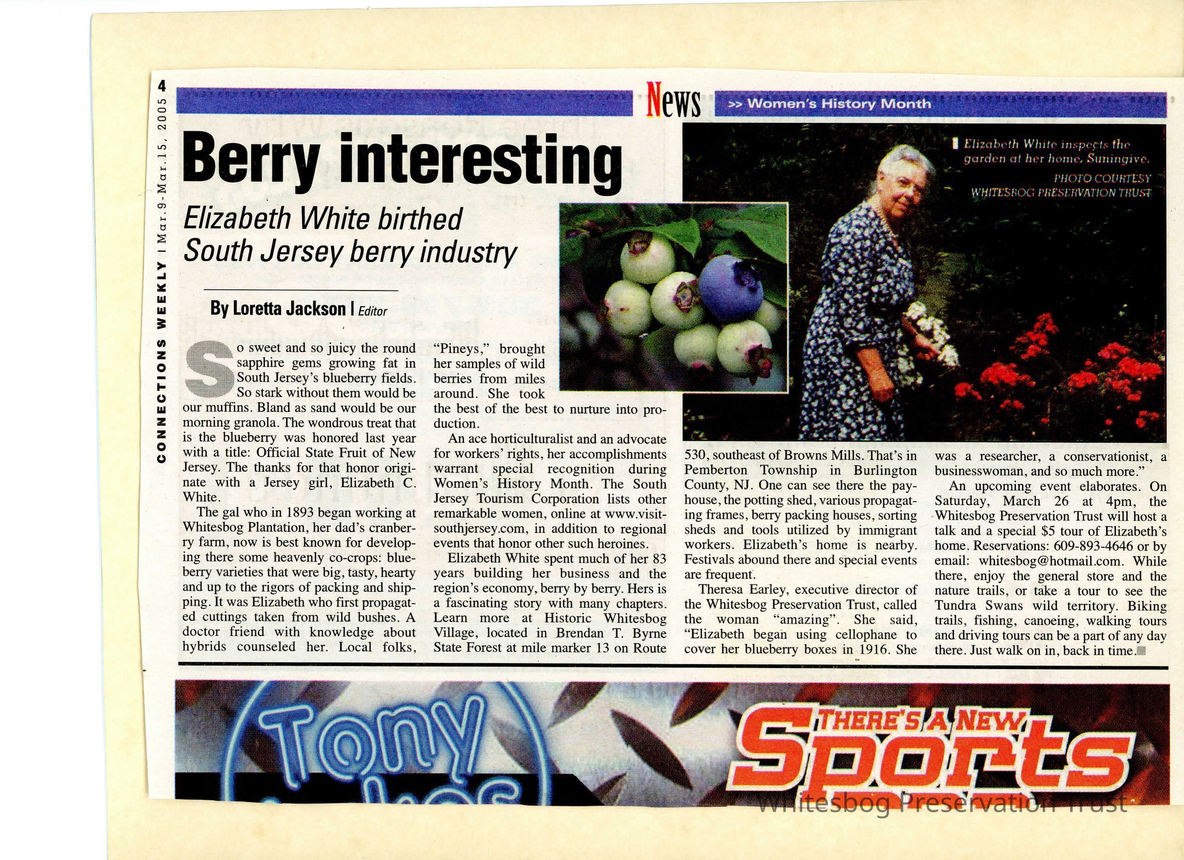 An article about Elizabeth White and her roll in making the blueberry a national hit. As the article states, "So stark without them (blueberries) would be our muffins."