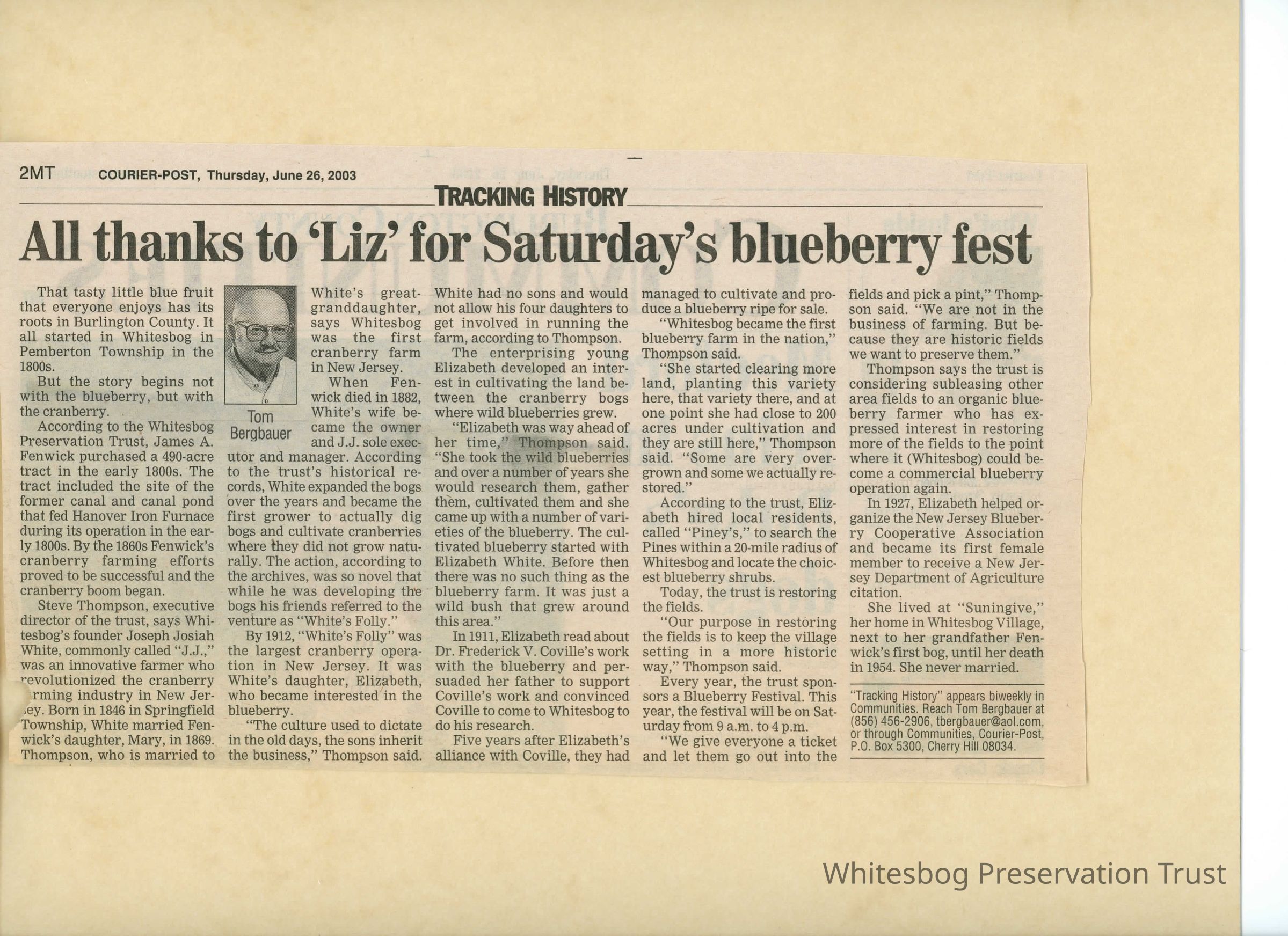 An article about the history of Whitesbog, mentioning the fact that J.J. White's neighbors called his original cranberry operation 'White's Folly' and the plan to sublease some of the blueberry fields to an organic farmer.