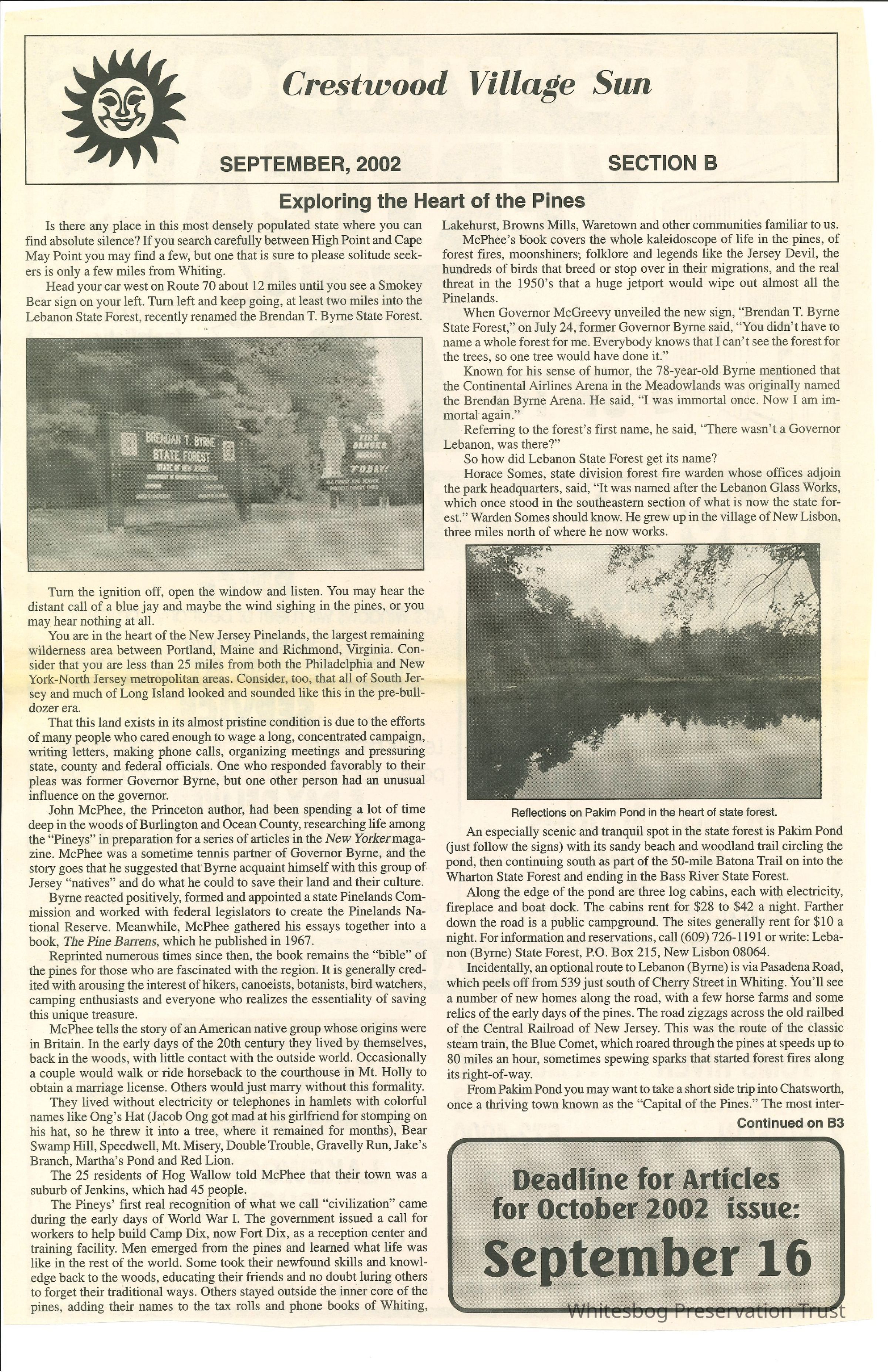 This is an article about the Pinelands area of New Jersey, noting that it is the largest remaining wilderness area between Portland, Maine and Richmond, Virginia. The article also makes note of the recent renaming of the Lebanon State Forest to the Brendan T. Byrne State Forest. Byrne, former governor of New Jersey, helped to ensure the preservation of the Pinelands. Includes seven pictures.