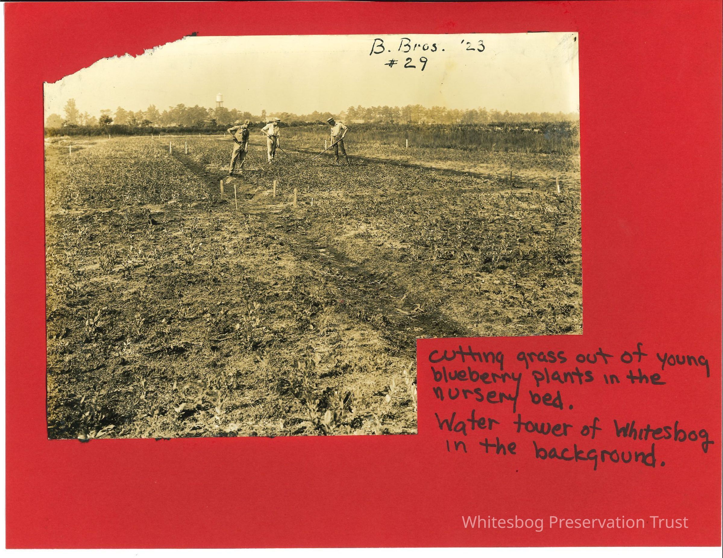Three men cutting grass out of blueberry nursery bed. Water tower of Whitesbog in the background.