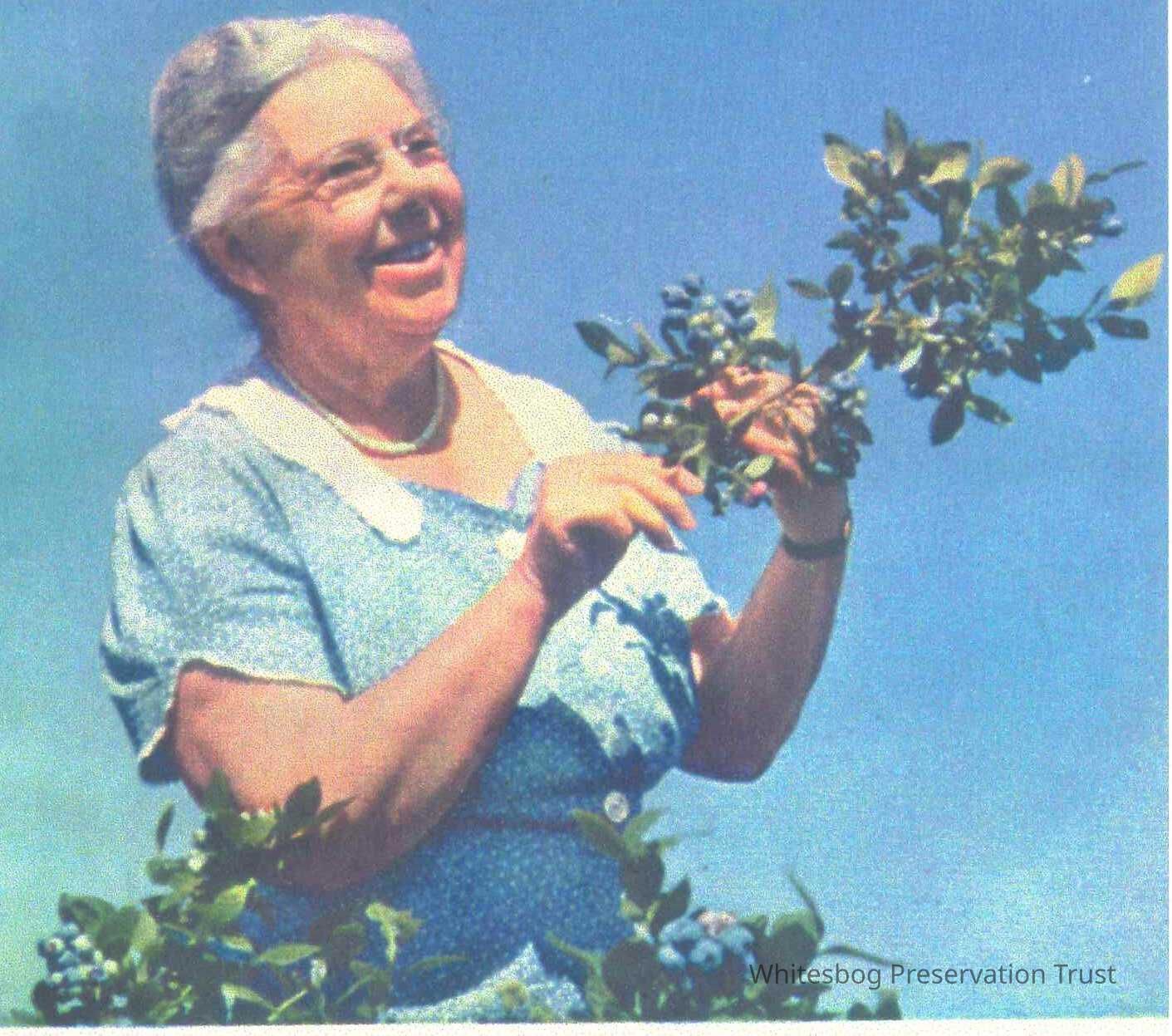 Color photo of Elizabeth White along with branches from a blueberry bush.