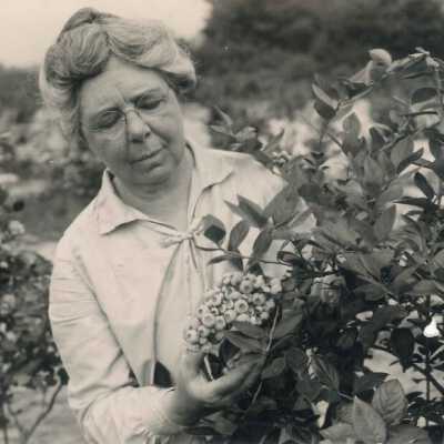 A close up of Elizabeth White standing in the field looking at a blueberry bush. Six copies in different sizes.