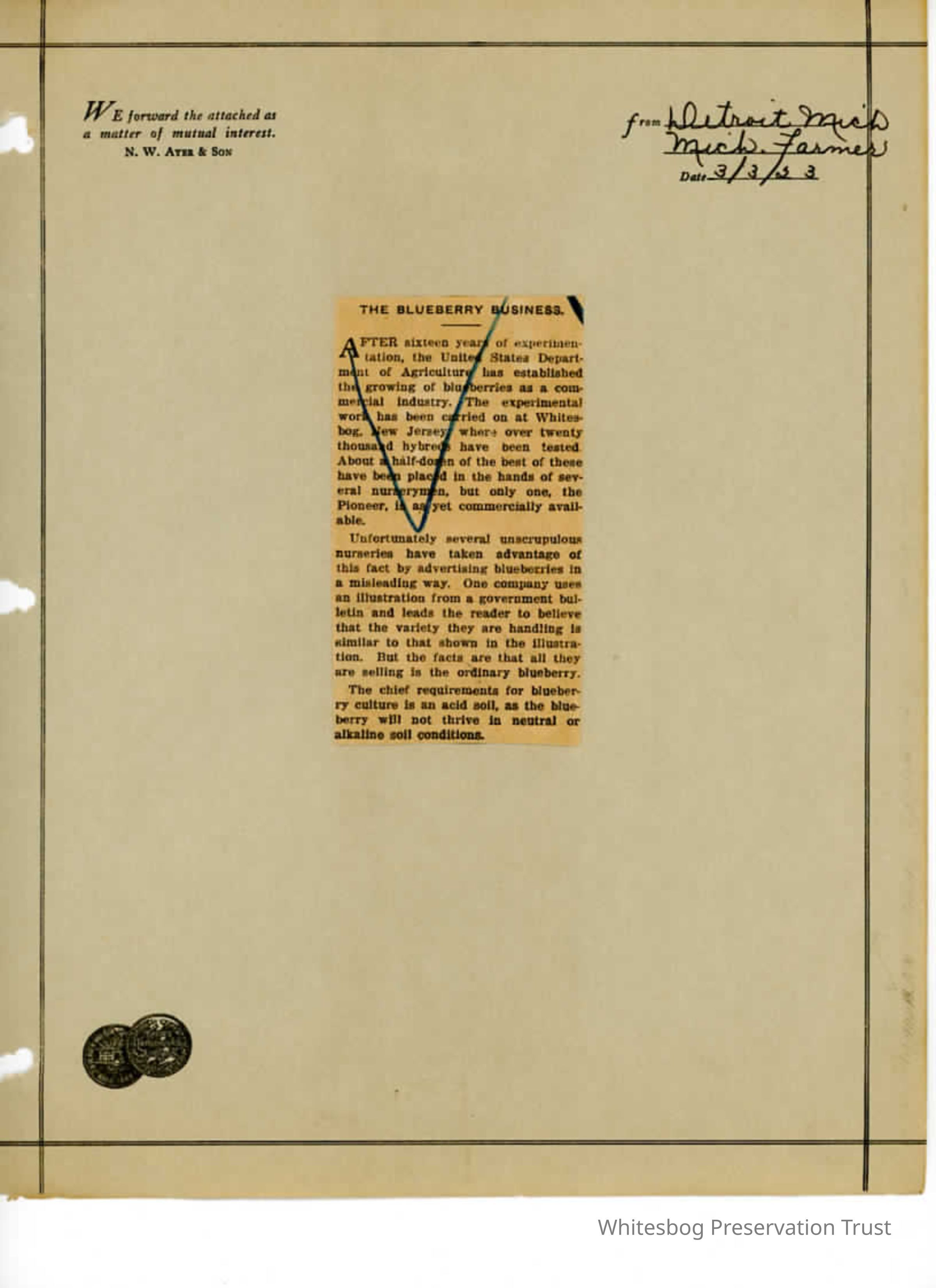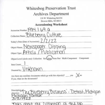 "The Blueberry Business" - Detroit, Michigan Michigan Farmer March 3rd, 1923 Talks about the cultivation of the blueberry