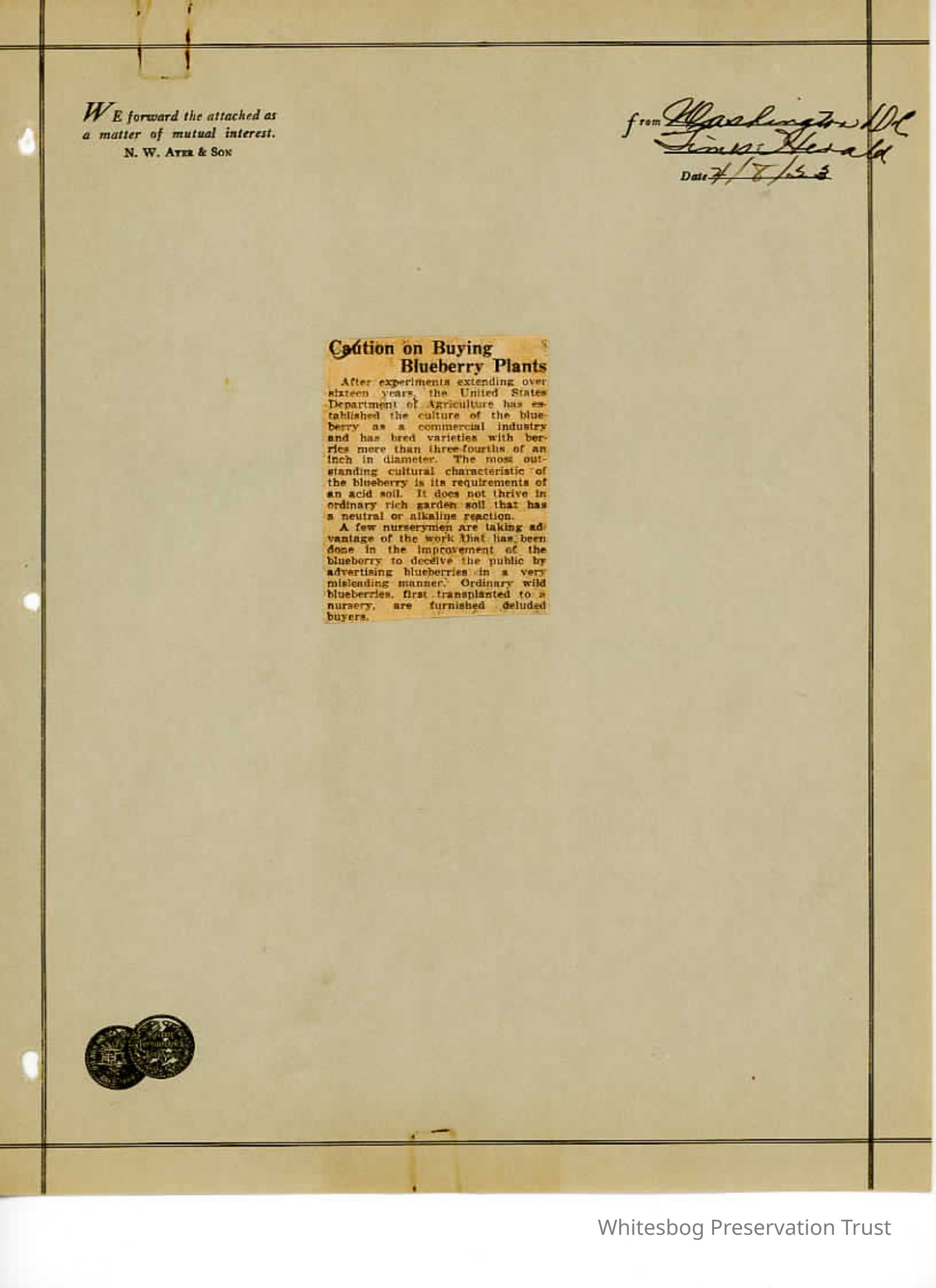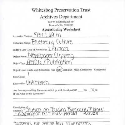 "Caution on Buying Blueberry Plants" - Washington, D.C. Times-Herald April 8, 1923 Nurseries are selling fake blueberries.