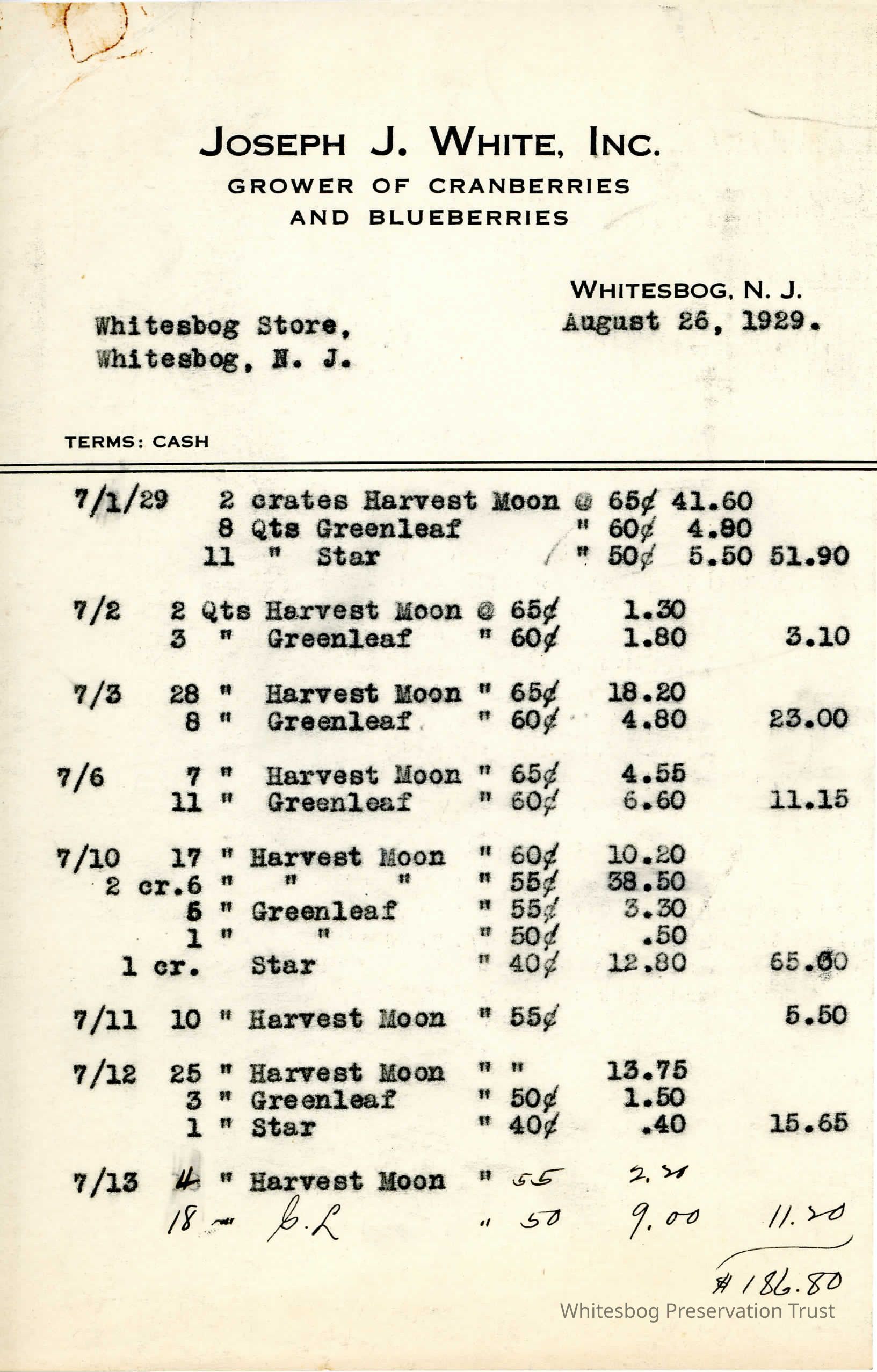 A list from Joseph J. White Inc., Whitesbog Store listing the sale of Harvest Moon, Greenleaf and Star brand blueberries from 7/1/29 - 8/6/29.