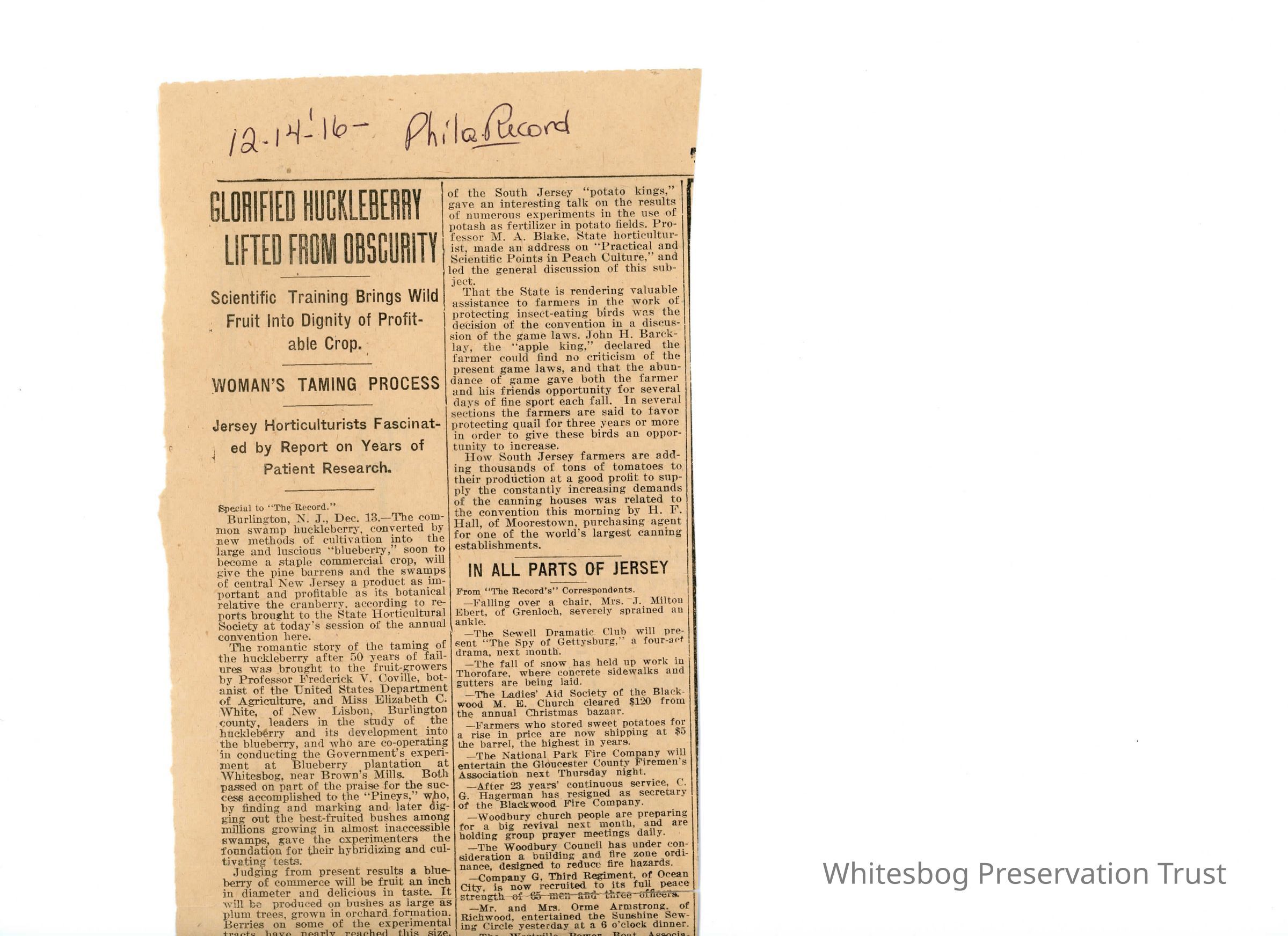 Source: Philadelphia Record Author: Unknown Summary: Newspaper report on proceedings of New Jersey Horticultural convention. The work of Elizabeth C White and Frederick V. Coville were given prominent place in the proceedings.