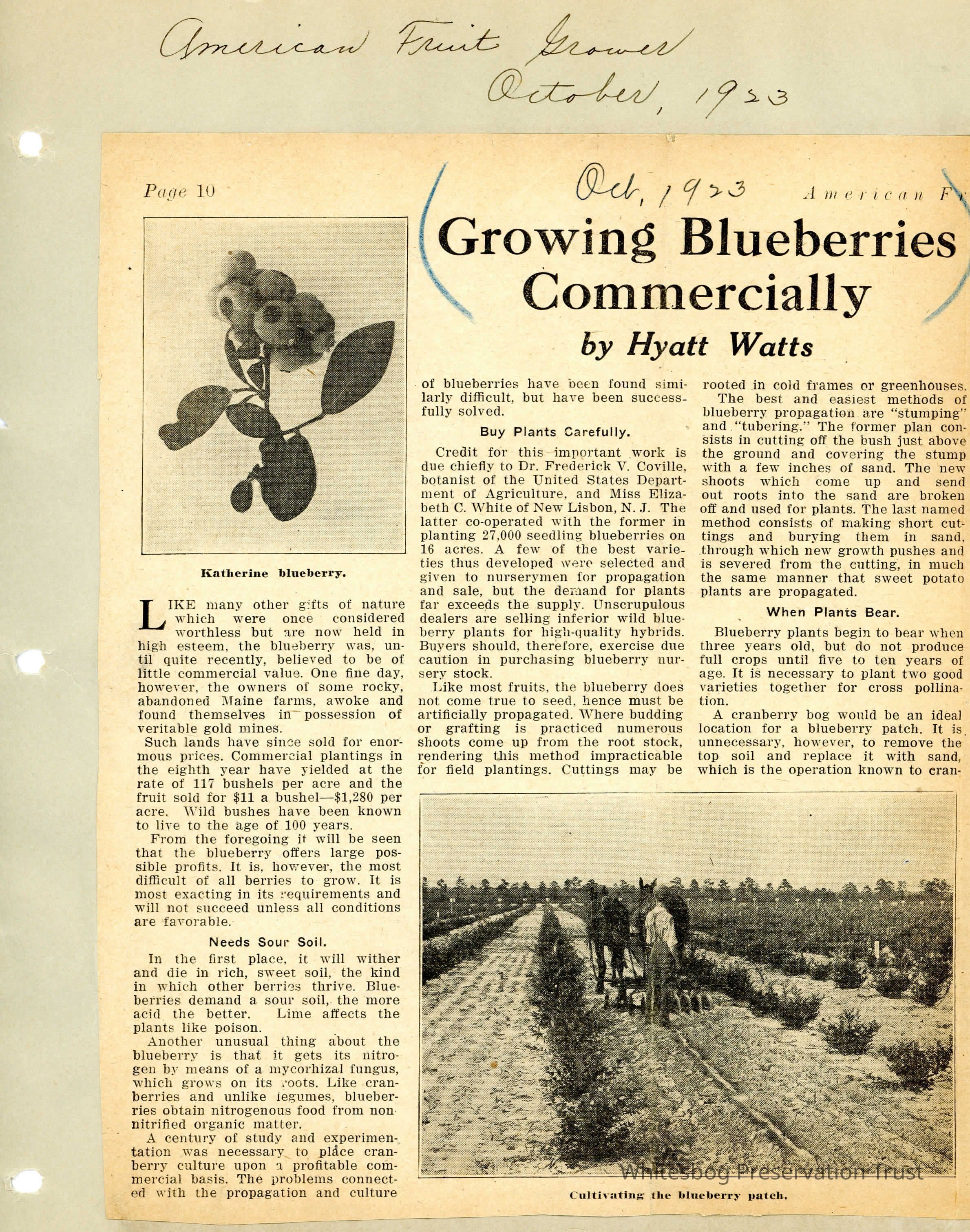 Includes pictures of the Katharine Blueberry, typical blueberry bush and cultivating a blueberry patch.Collection