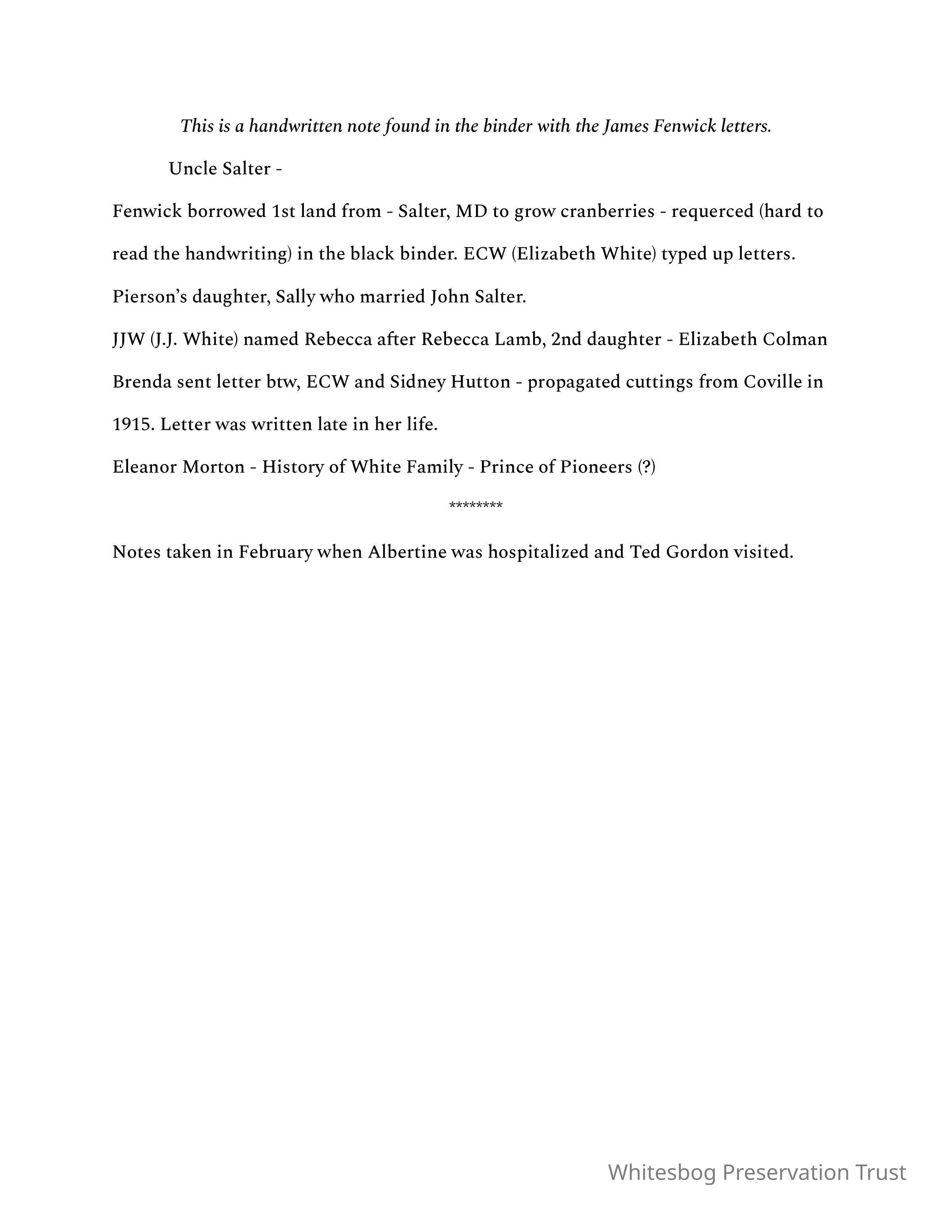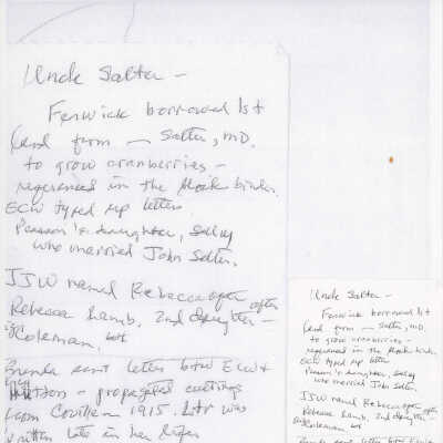 These were notes taken in February (year unknown) when Ted Gordon visited, at the time archivist, Albertine Senske was hospitalized. It is unknown who took the notes.