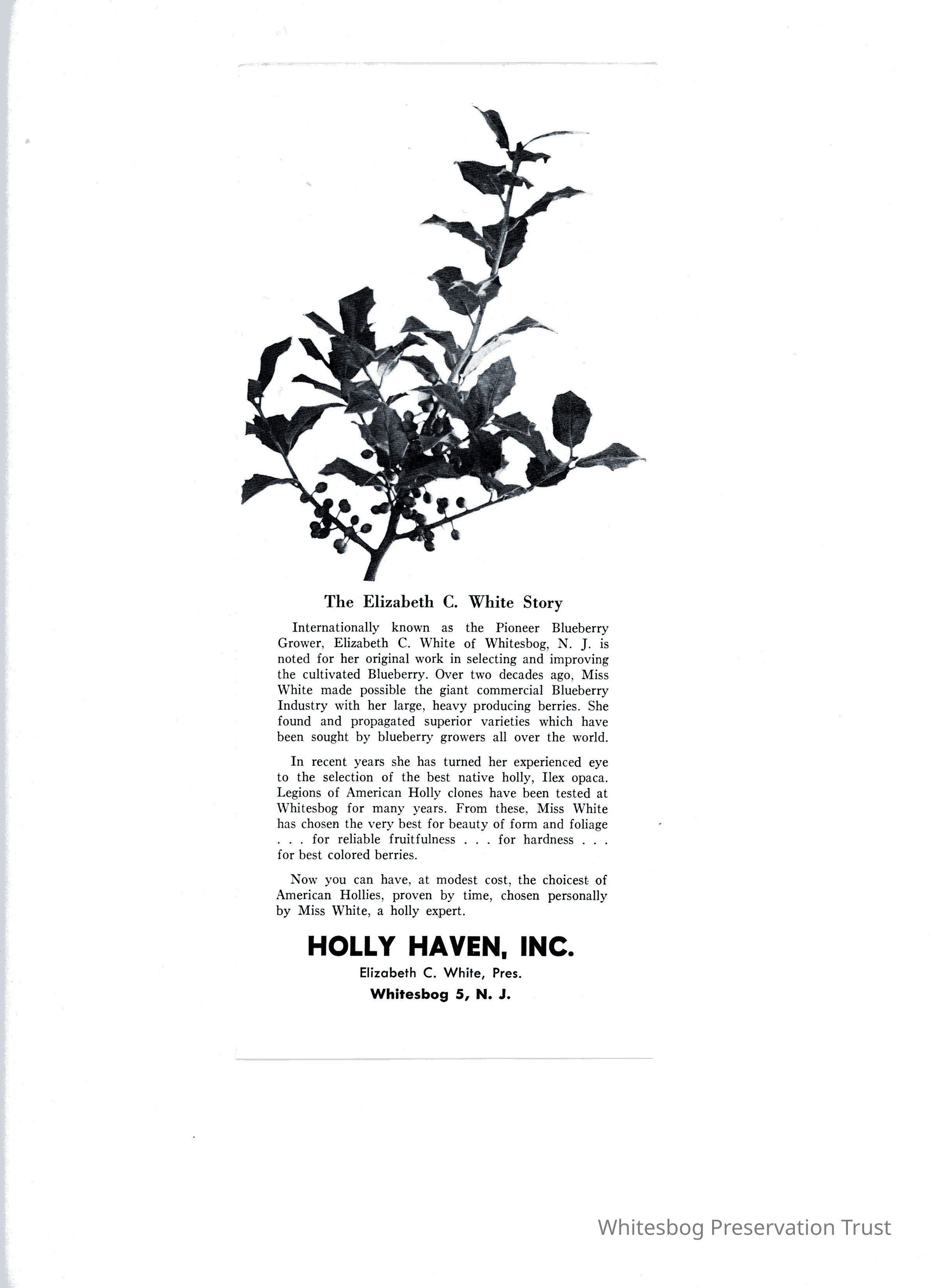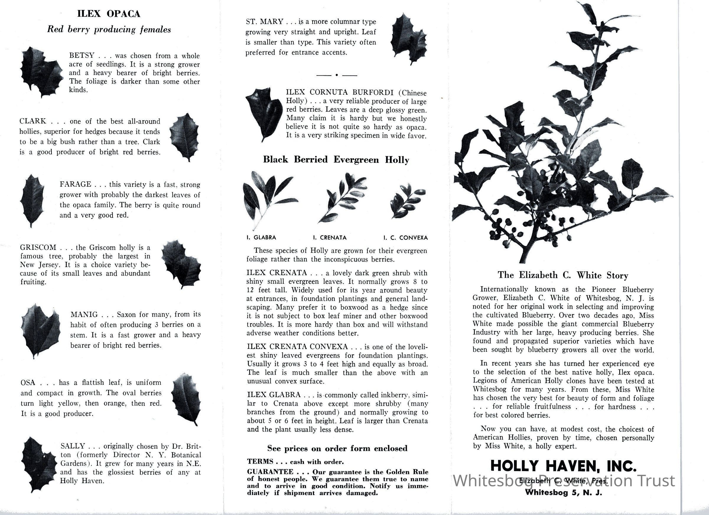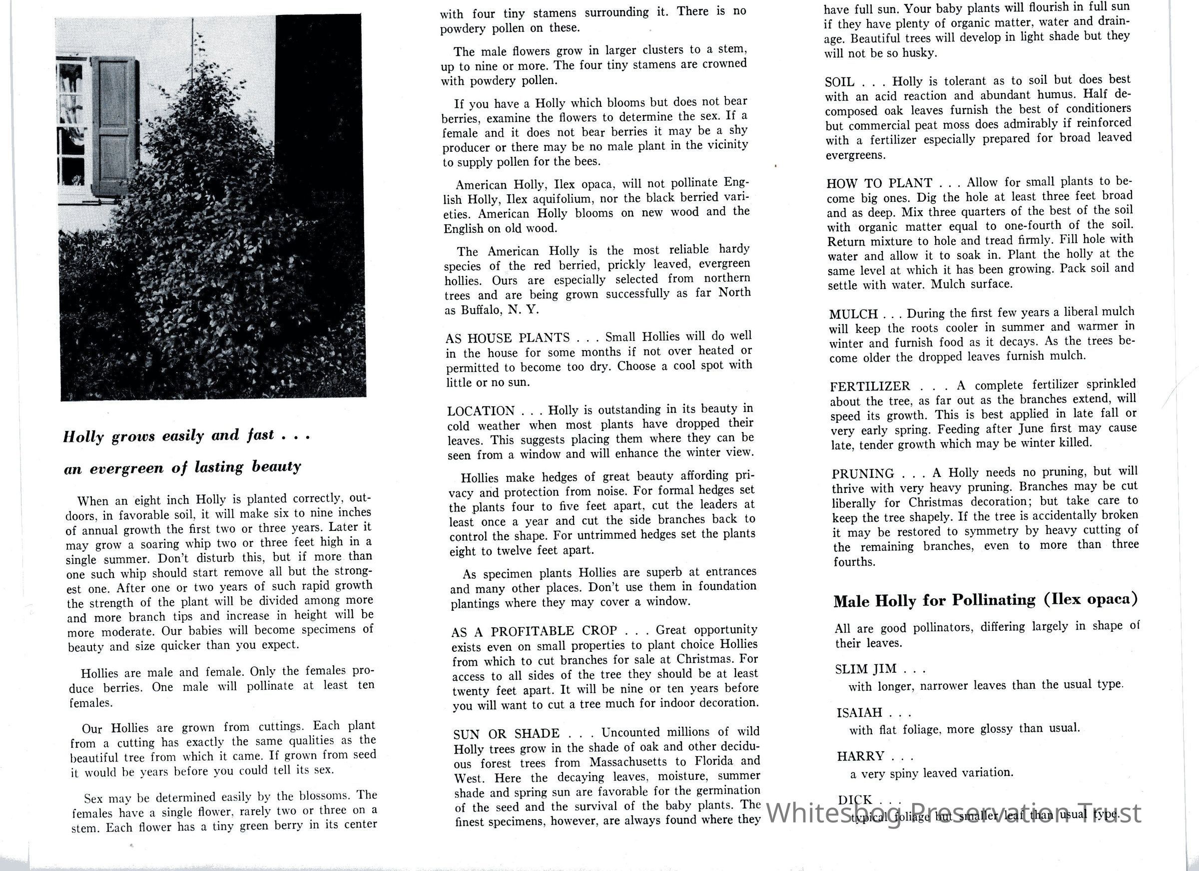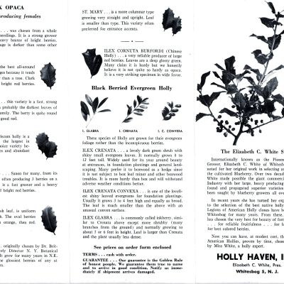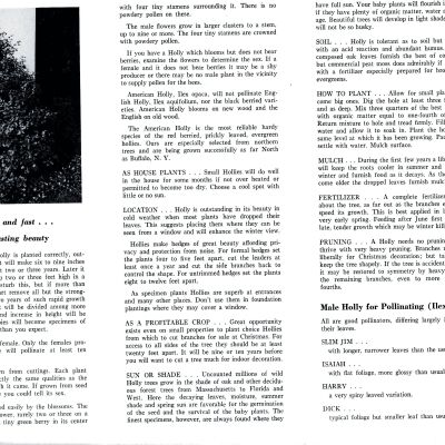The brochure contains a write up of holly culture and a description of Male and Female Hollies. An illustration of the leaf of each variety accompanies each description.