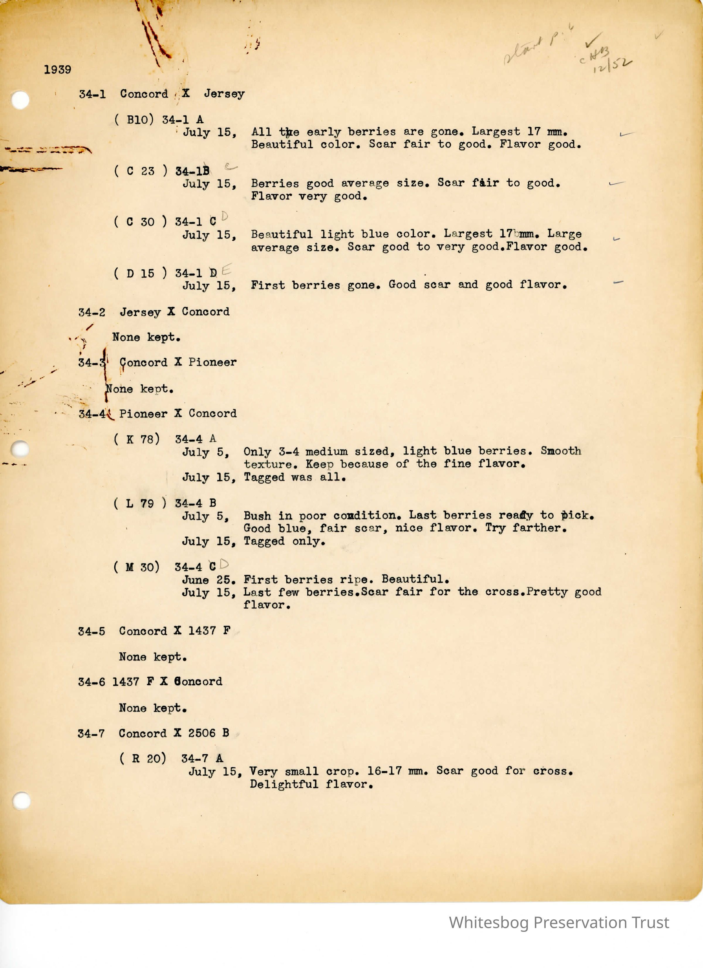 Parentage of the hybrid is given. Development progress and evaluation is provided by plant variety, sometimes by individual plant. Evaluation carried on mostly in July 1939. There are multiple pages to this report.