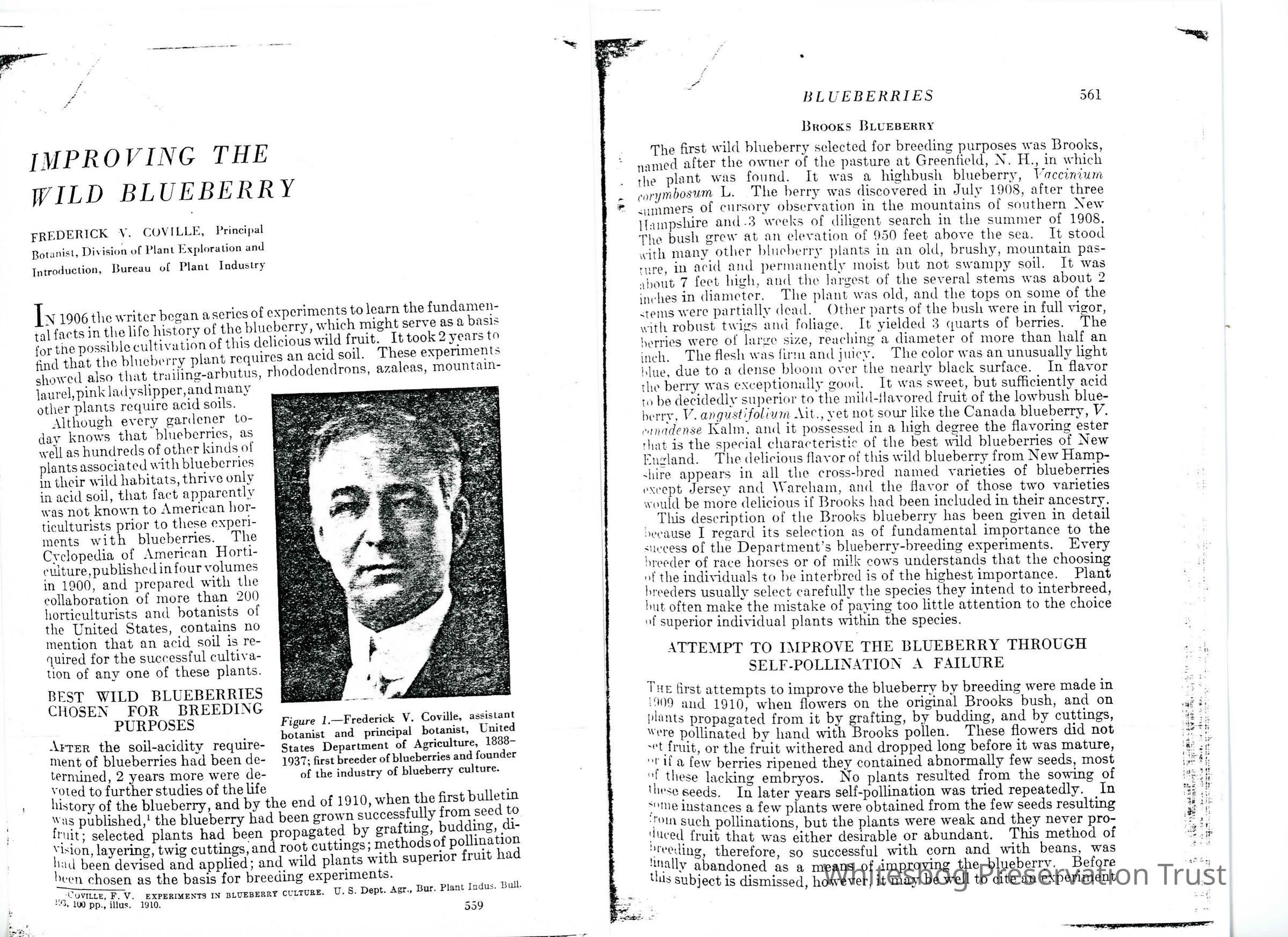 Summary: Coville discusses the life history of the blueberry including soil requirements, results of self-pollination and testing. Individual improved varieties are mentioned and briefly described. They are Pioneer, Cabot, Katharine, Rancocas, Jersey, Concord, June, Scammell, Stanley, Redskin, Catawba, Wareham, Weymouth, GM37 and Dixi.Collection