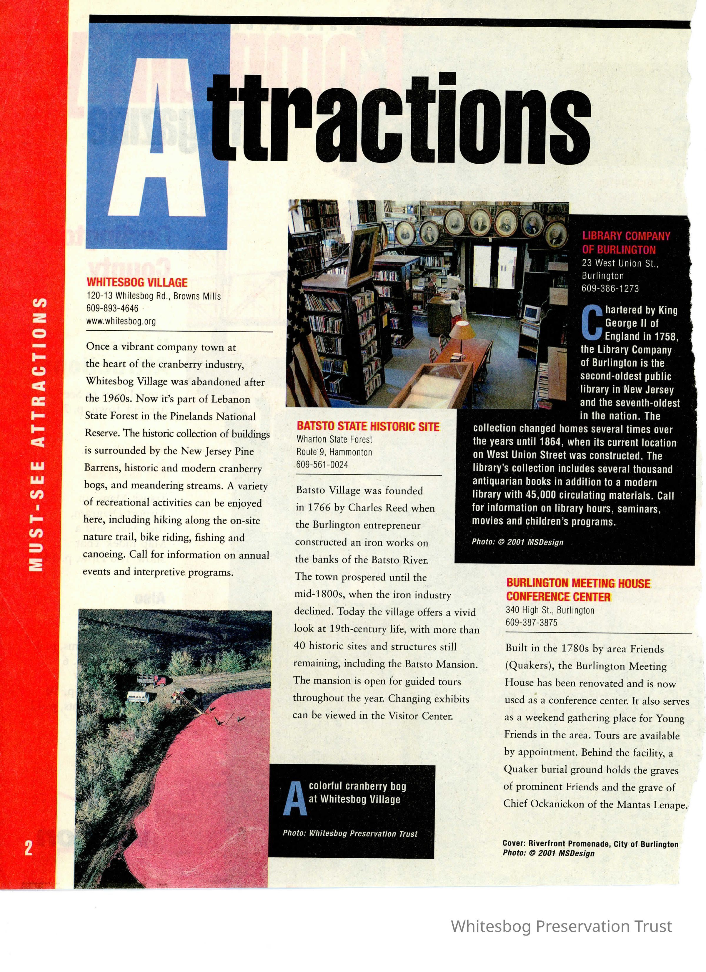 An advertisement encouraging people to visit Whitesbog. The exact date is unknown, however guessing 2001-2003 given that the copyrights are for 2001.