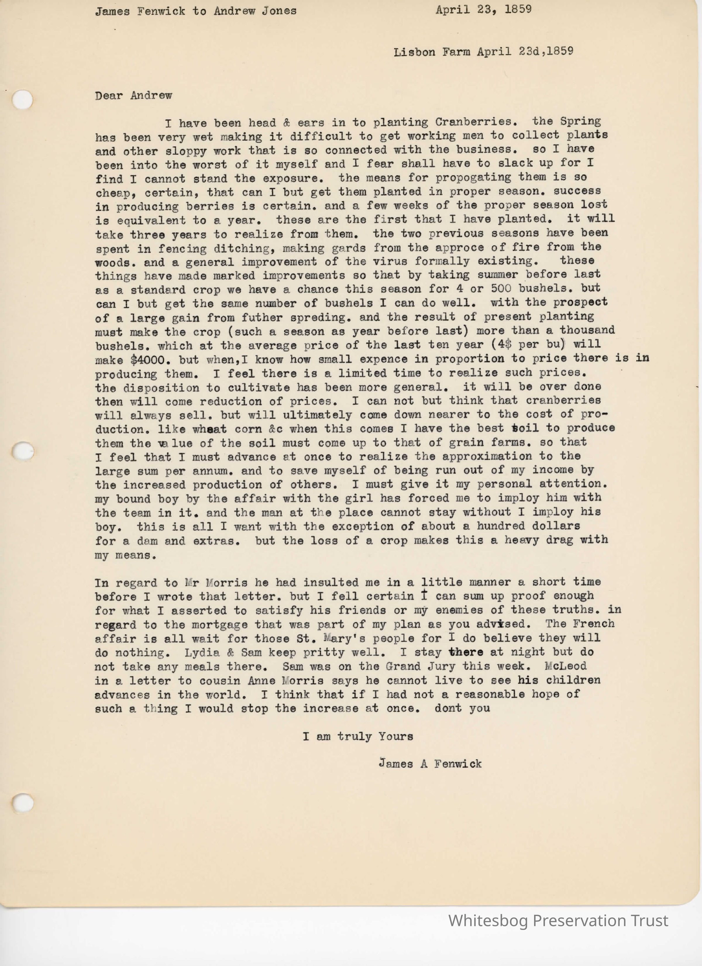 James Fenwick to Andrew Jones - April 23, 1859Entry/Object ID