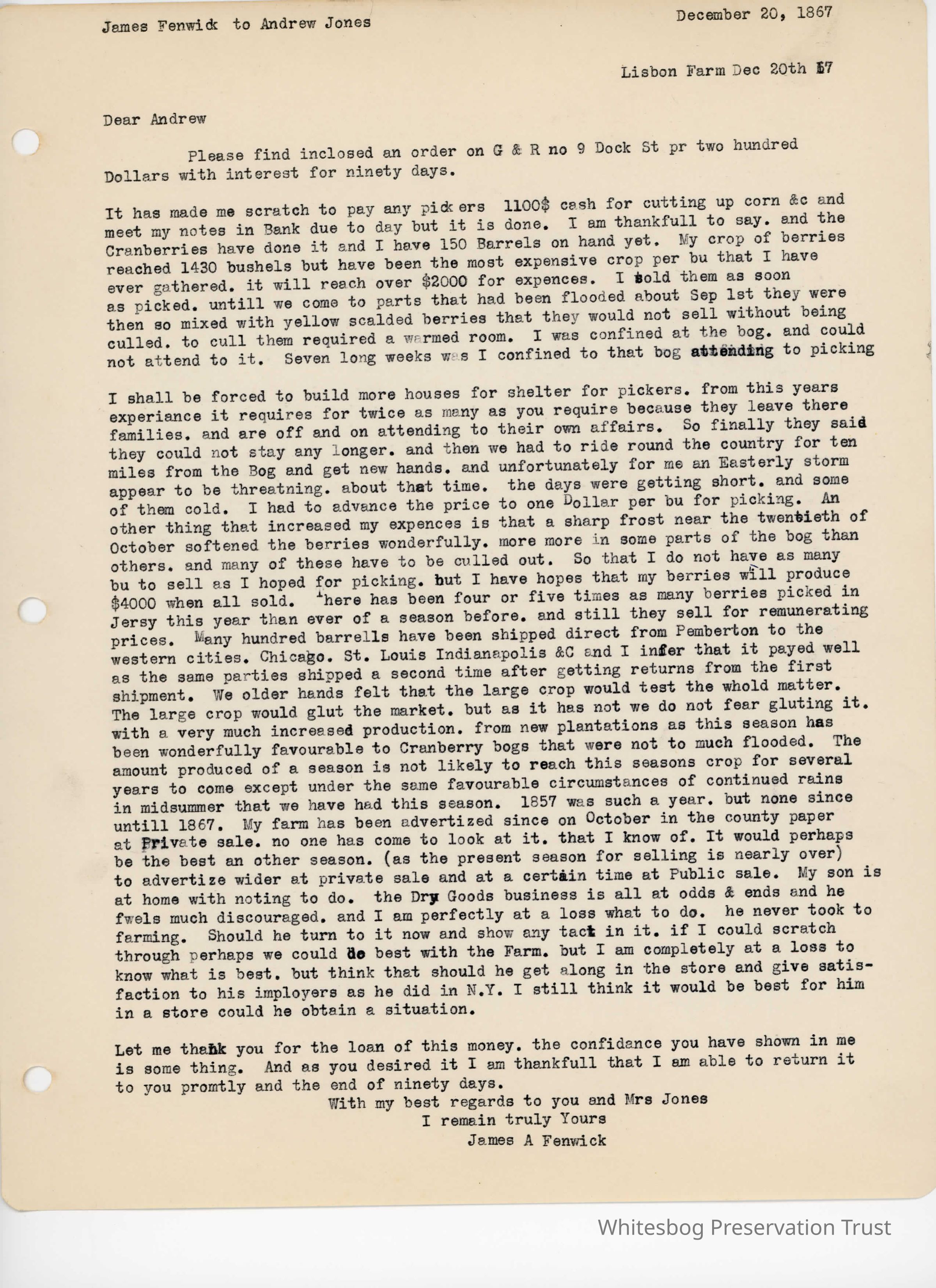 Fenwick gives Jones an overview of the cranberry harvest, which needed a great deal of personal attention as Fenwick spent seven weeks at the bog. Fenwick also writes that no one has offered to buy the Lisbon farm, and that Thane's job did not last as long as hoped.