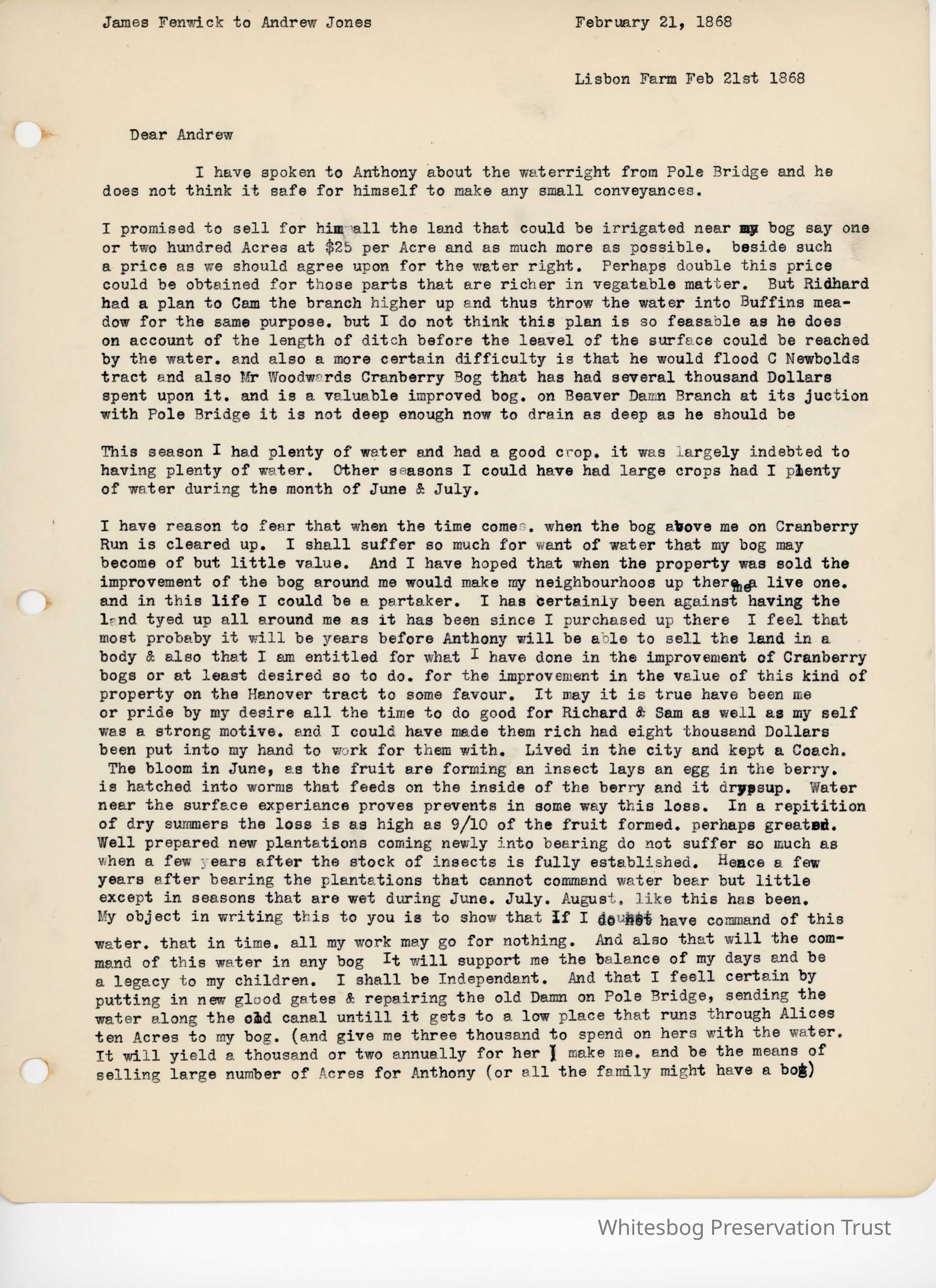 In this letter Fenwick expresses concern over a water rights issue tied up with Pole Bridge, land owned by Jones' brother-in-law, Anthony Morris. Fenwick is worried that his access to plenty/enough water will be cut off, and looks to Jones for advice.