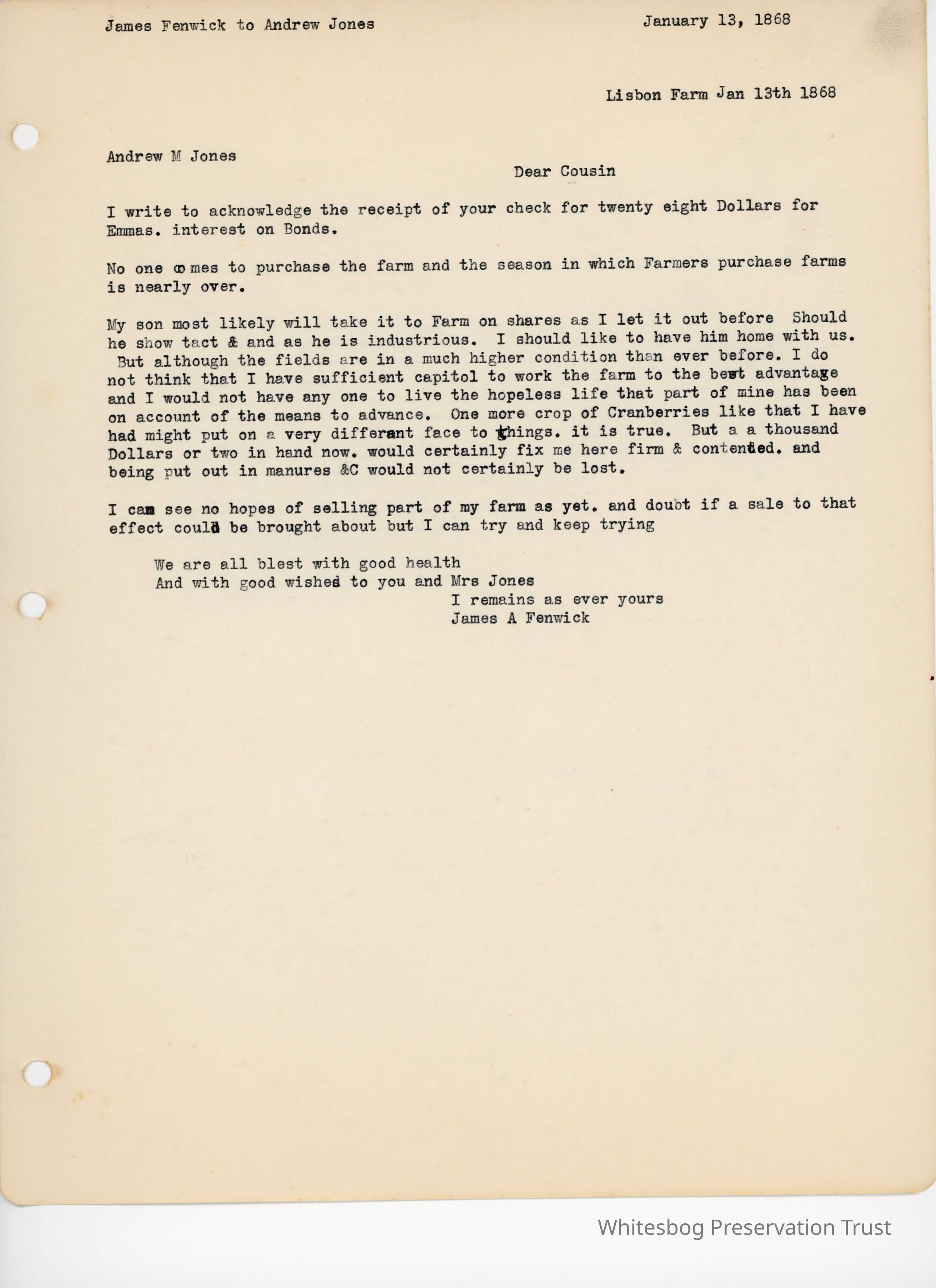 James Fenwick to Andrew Jones - January 13, 1868
