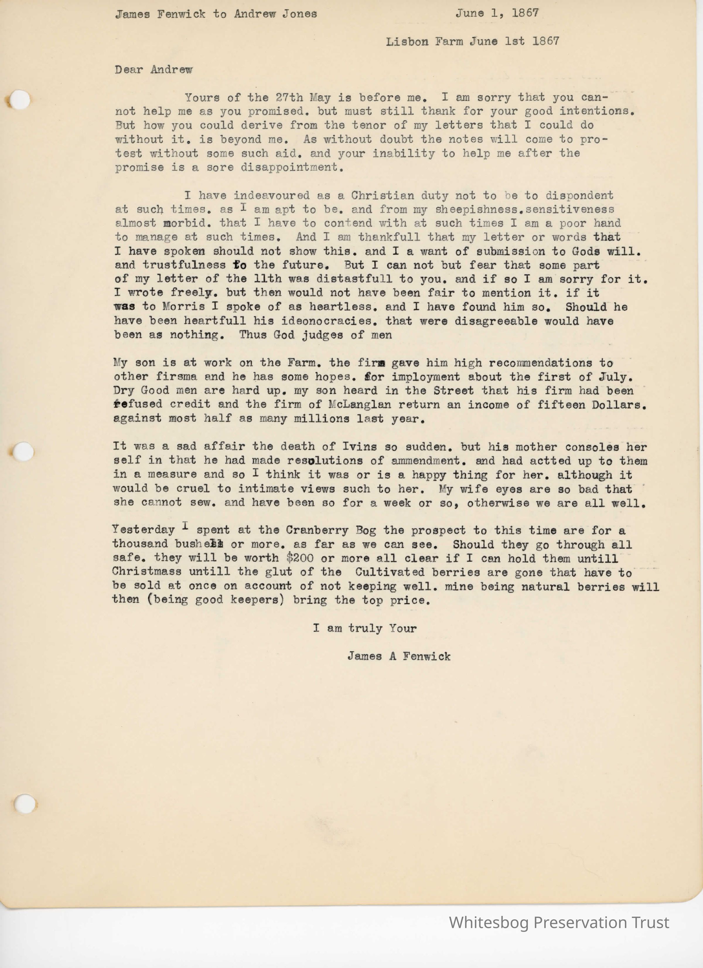 James Fenwick to Andrew Jones - June 1, 1867Entry/Object ID