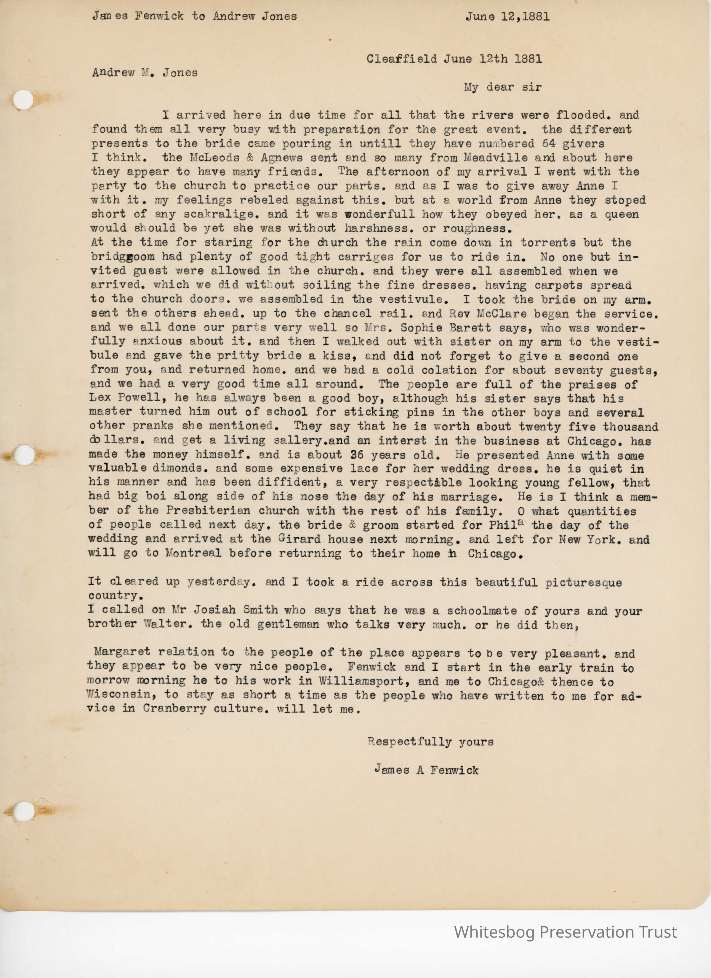 James Fenwick to Andrew Jones - June 12, 1881Entry/Object ID