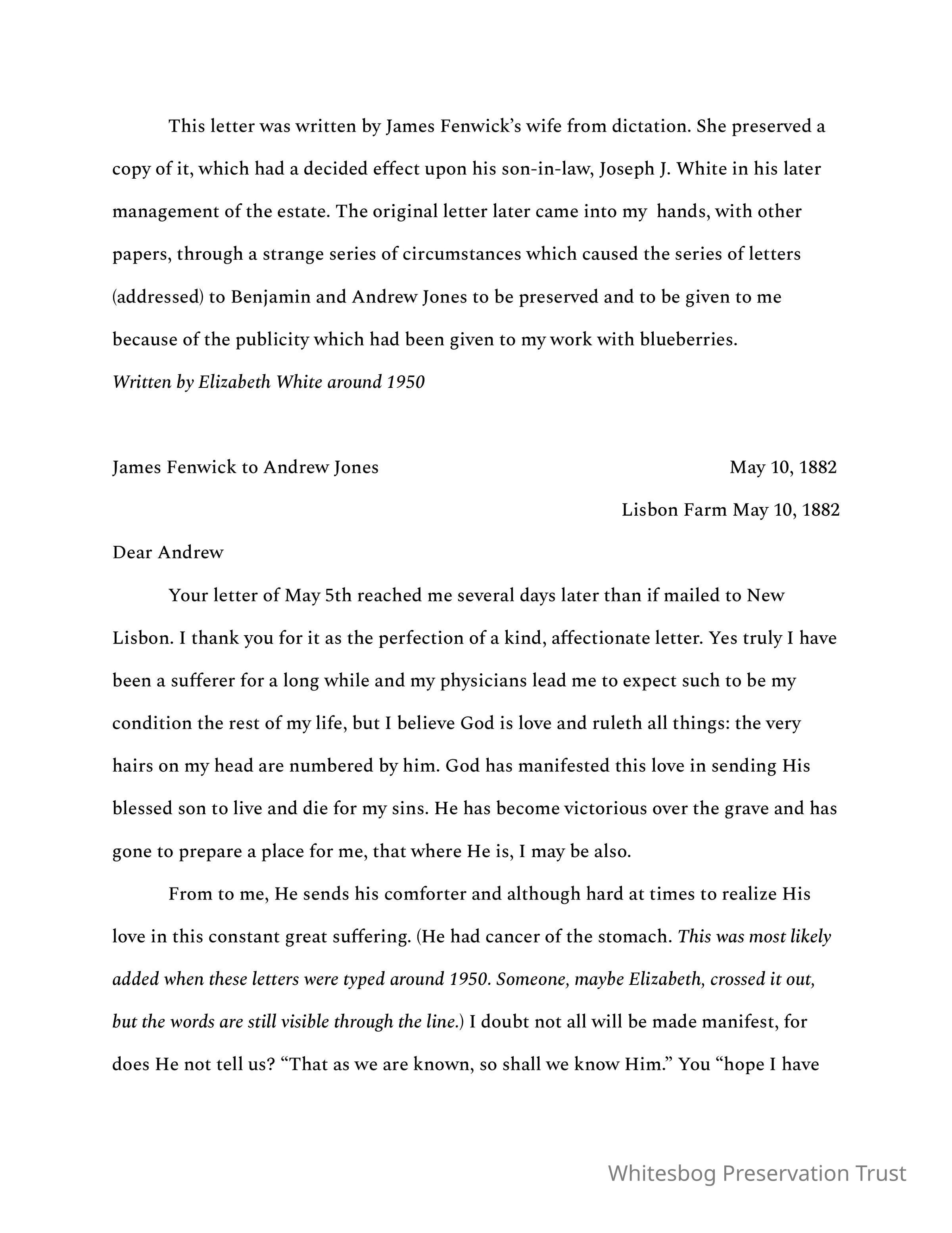 This final letter (that we have) to Andrew Jones was dictated to Mary Fenwick by James. He thanks Jones for his kindness over the years. Fenwick writes in his will that Mary Fenwick and then Minnie White will have the land in their names, and J.J. White is the executor of his estate. Fenwick is hopeful for the future of his cranberry bogs and is grateful that he has been able to pay many debts.