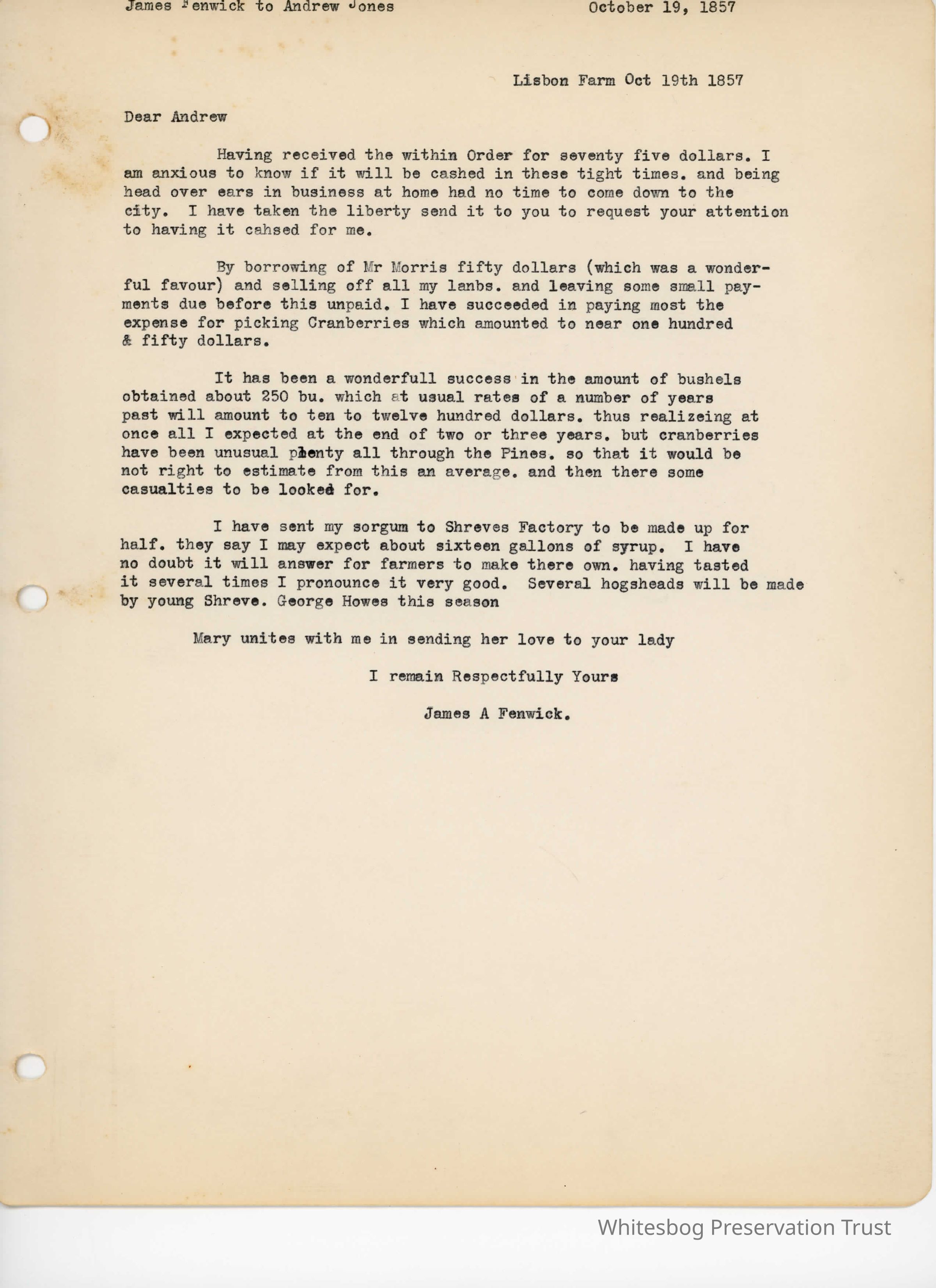 In this letter Fenwick gives Jones an update on how things are going at the farm, which includes a successful first cranberry harvest.