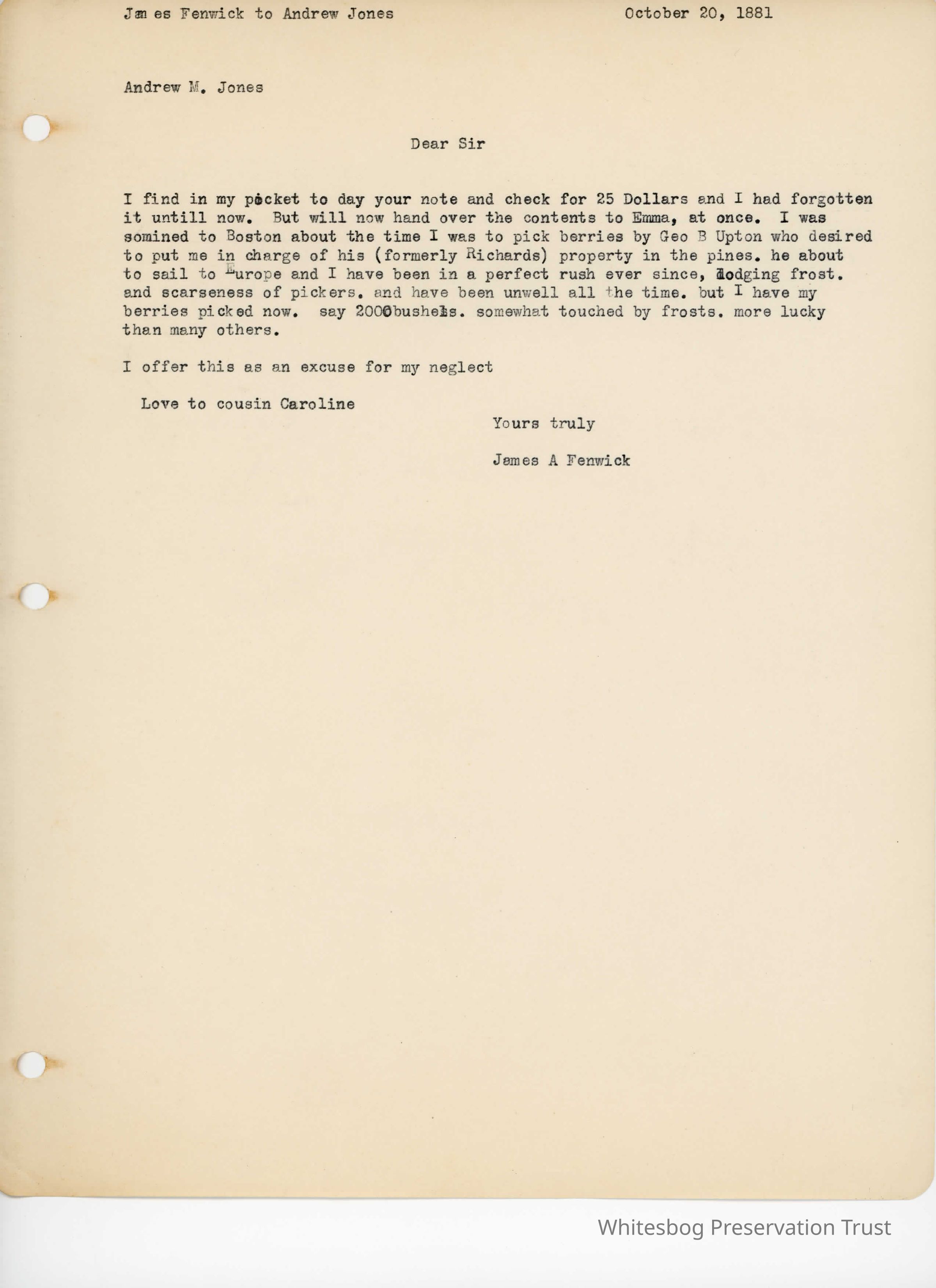 James Fenwick to Andrew Jones - October 20, 1881Entry/Object ID