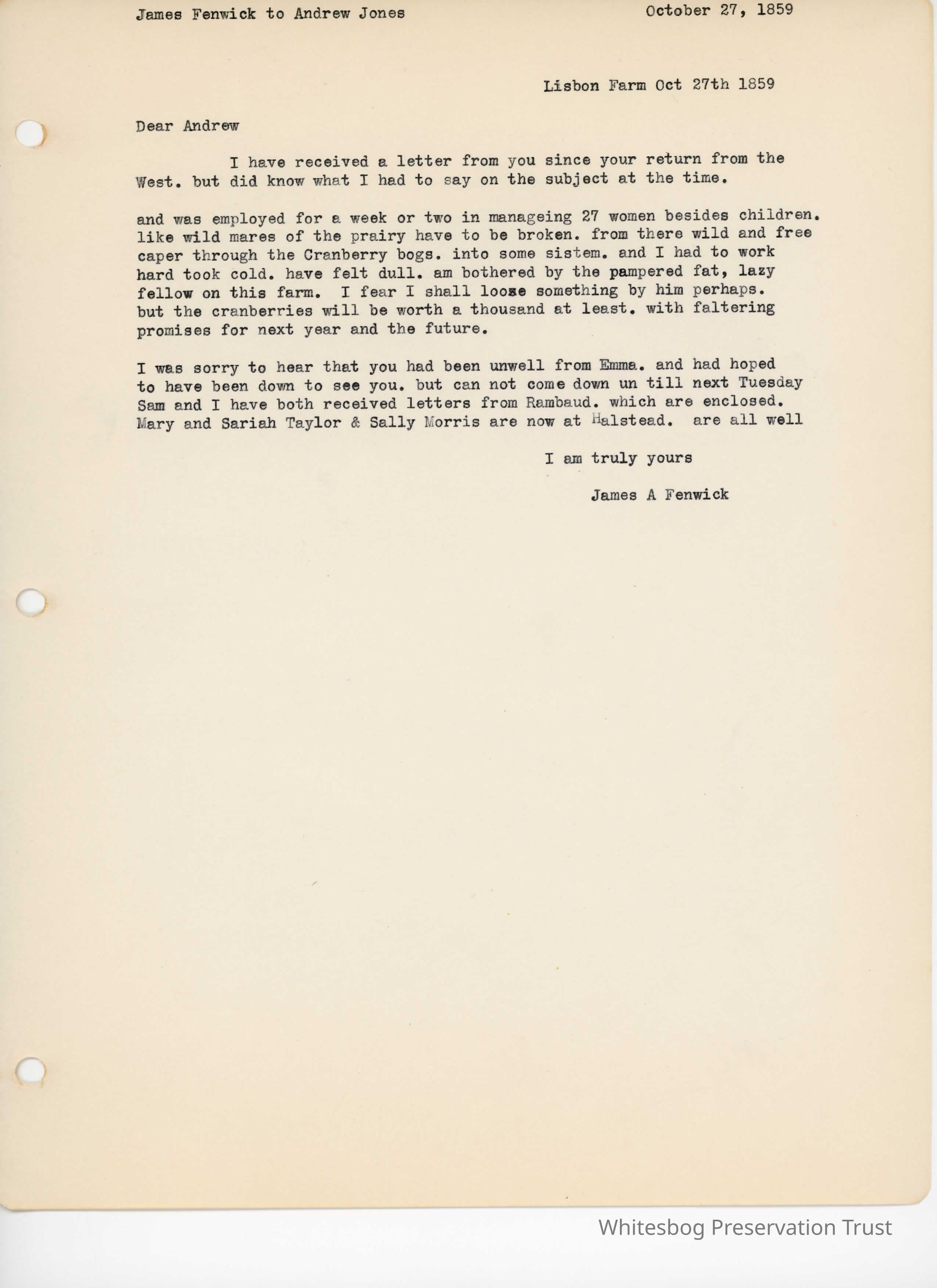 James Fenwick to Andrew Jones - October 27, 1859Entry/Object ID