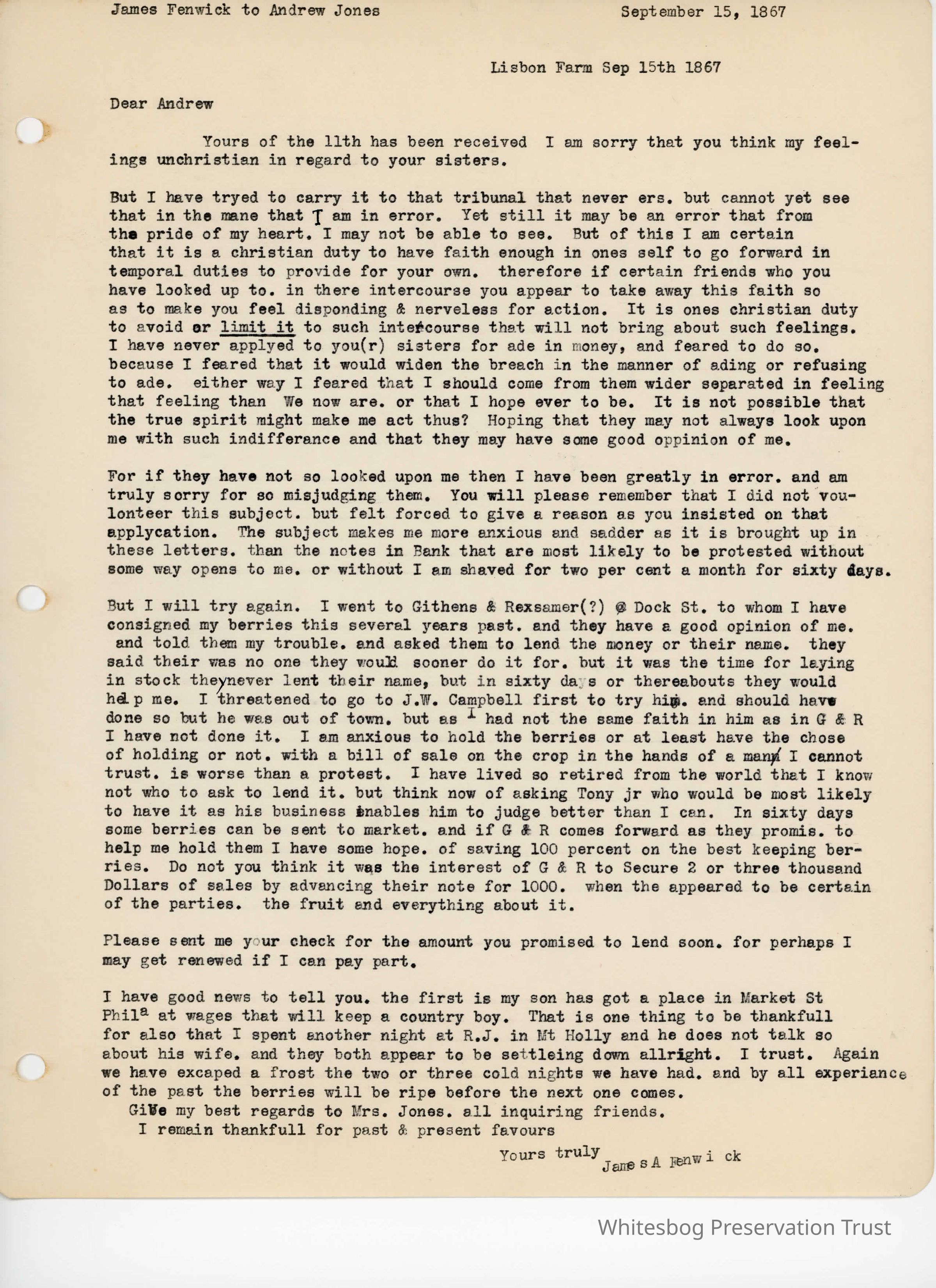 James Fenwick to Andrew Jones - September 15, 1867Entry/Object ID