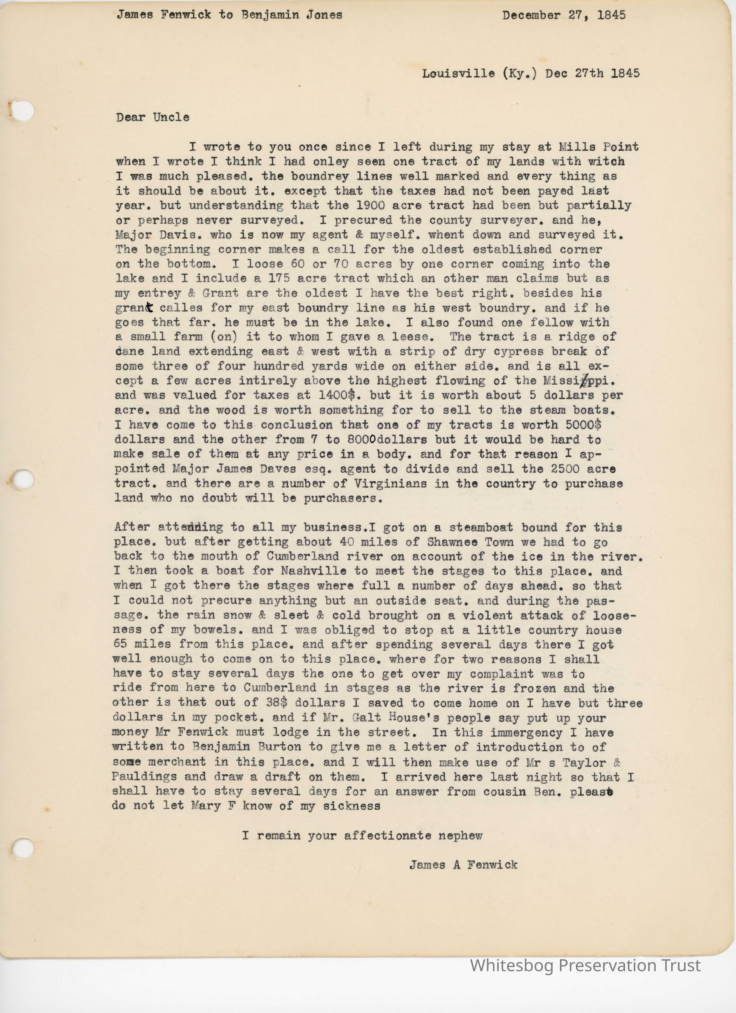 In this letter Fenwick writes again about the land and his hopes for it, although he is worried that the taxes have not been paid. He also lets Jones know that he is on his way back.