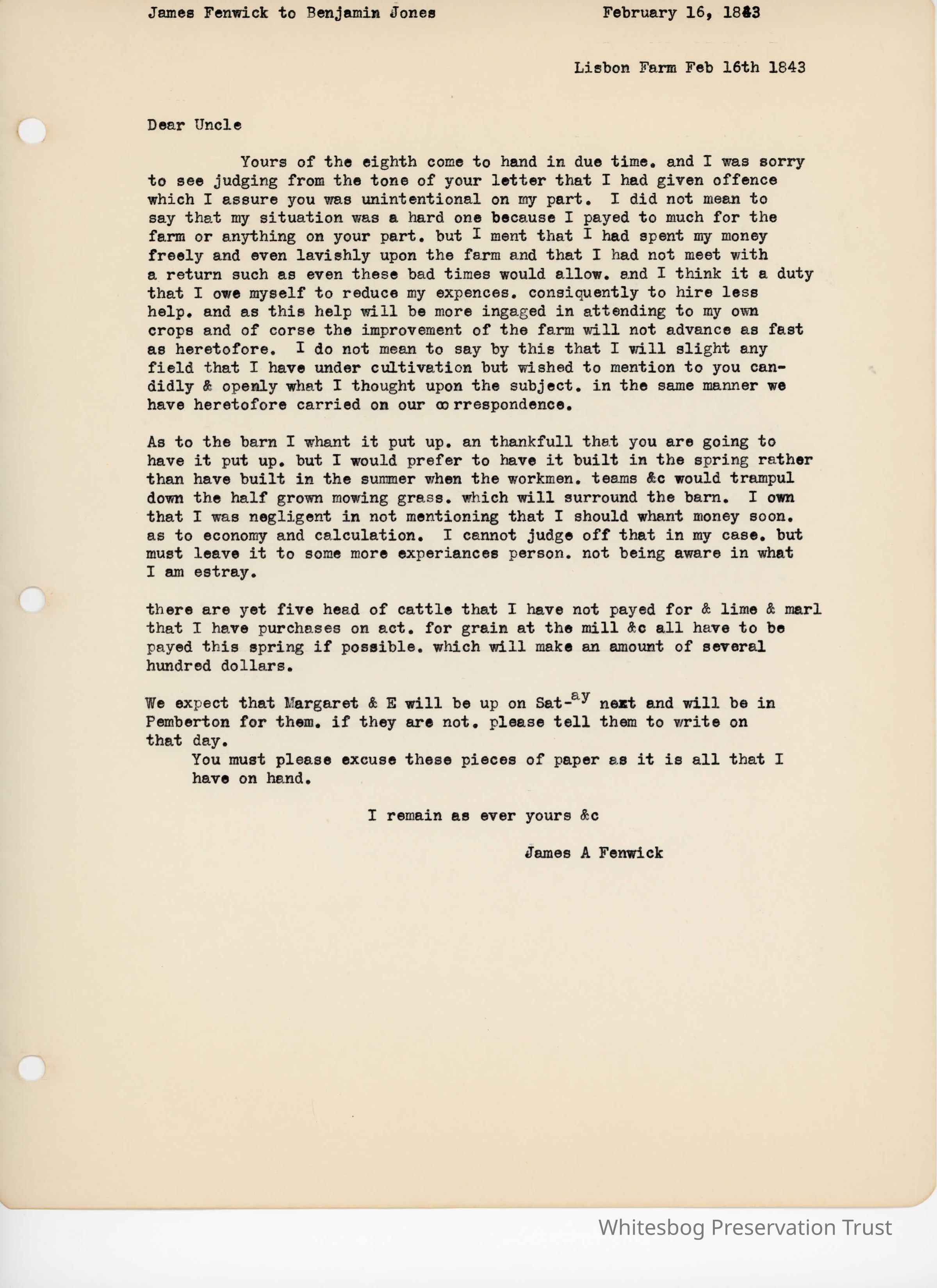 James Fenwick to Benjamin Jones - February 16, 1843Entry/Object ID