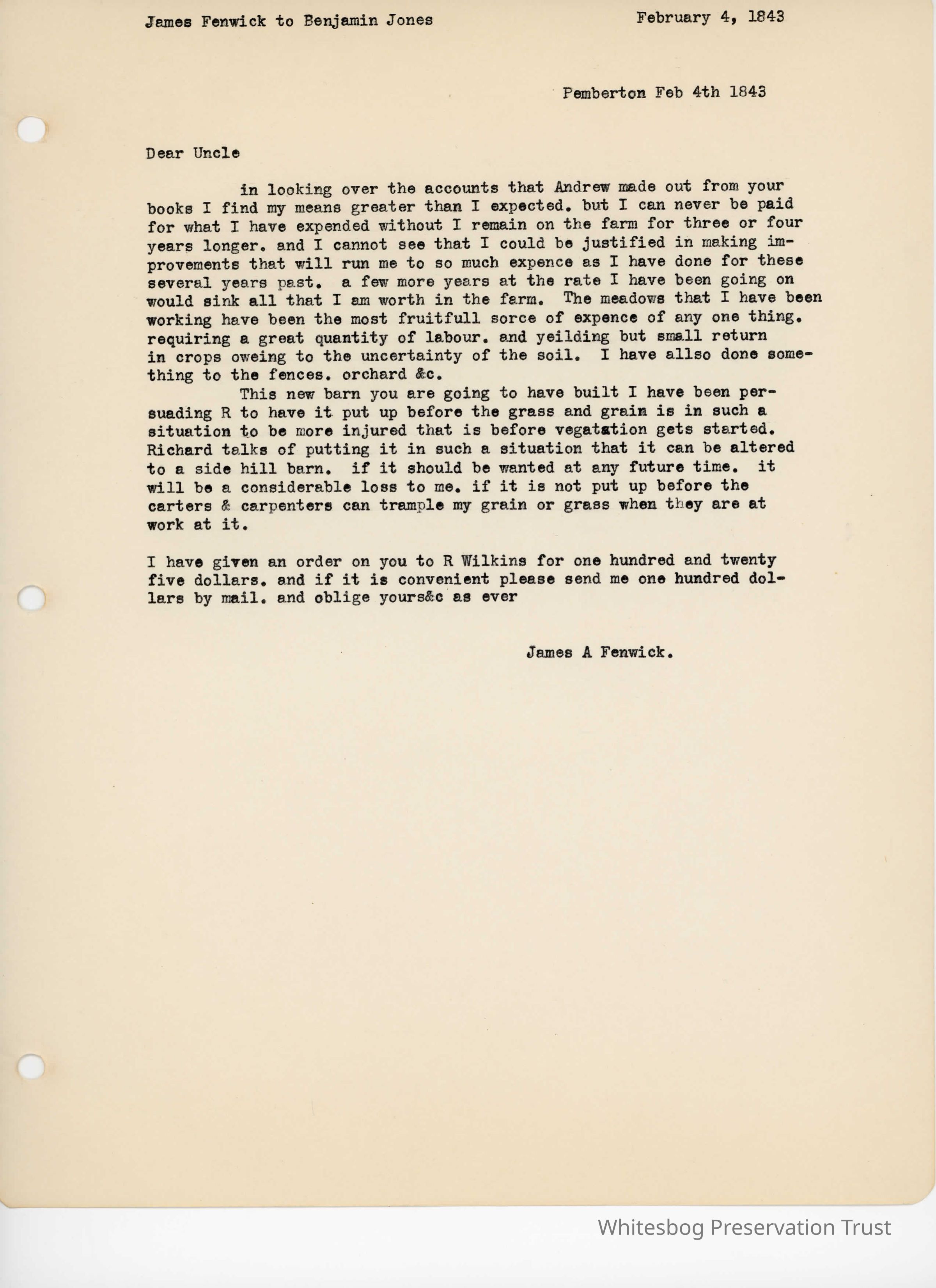 In this letter Fenwick comes to the realization that due to his debt to Jones he will have to remain on the farm, which it seems may not have been his intention. He also expresses hope that a new barn will be put up before planting time.