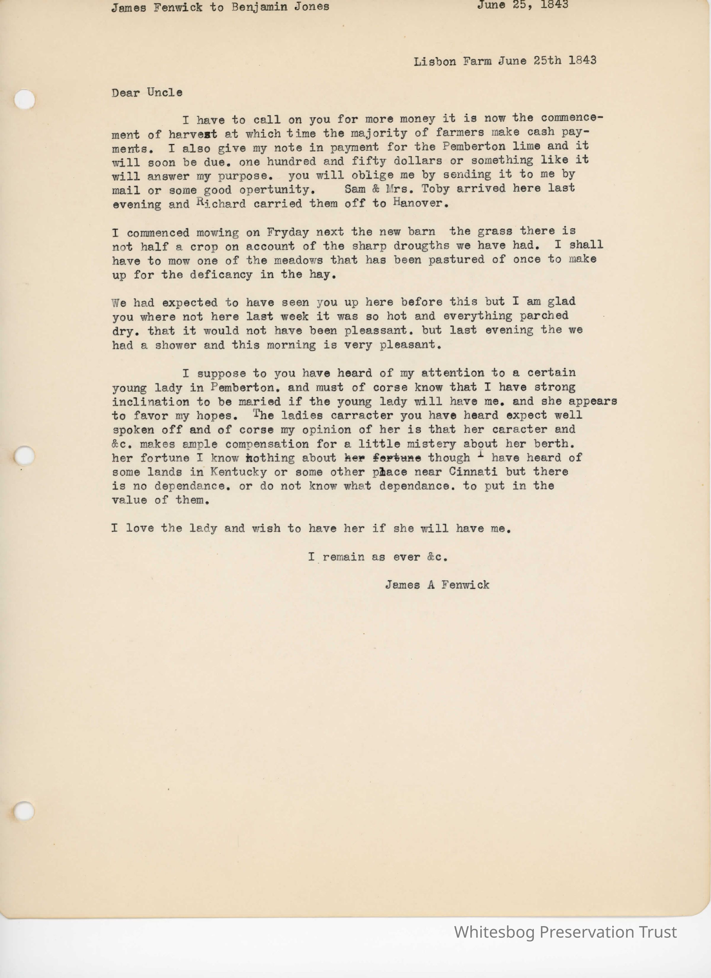 In this letter Fenwick updates Jones on how things are going at the farm, and also asks for more money. He also delivers some happy news, his intention to marry Mary Cashell. "I love the lady and wish to have her if she will have me."