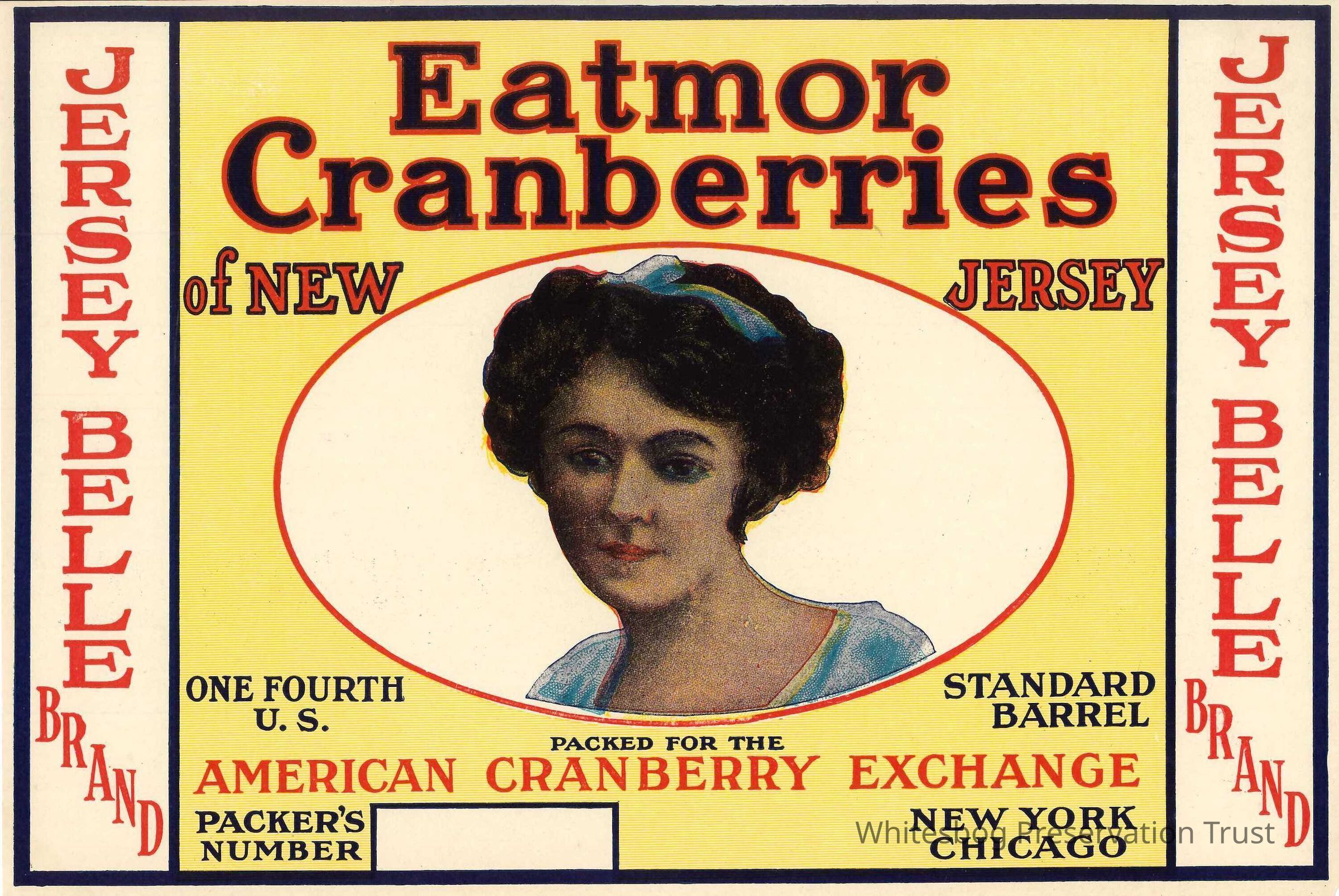 Cranberries were never marketed according to varietal (cultivar) names as apples are today. During the heyday of fresh fruit sales, they were sold by brand names or labels. Following in the footsteps of Wisconsin and New England Cranberry Companies, the Grower's Cranberry Company in New Jersey began in 1911 (until ca. 1947) using the brand name "Eatmor" to classify their berries with near scientific precision. Each variety of berries was divided into several brands by determining the degree of coloration, size, and keeping quality during shipment. A special, colorful brand label representing high quality was provided for each grade. About 32 brand labels were created, most of them under the Eatmor name. {Eck, Paul. The American Cranberry. Rutgers.1990}