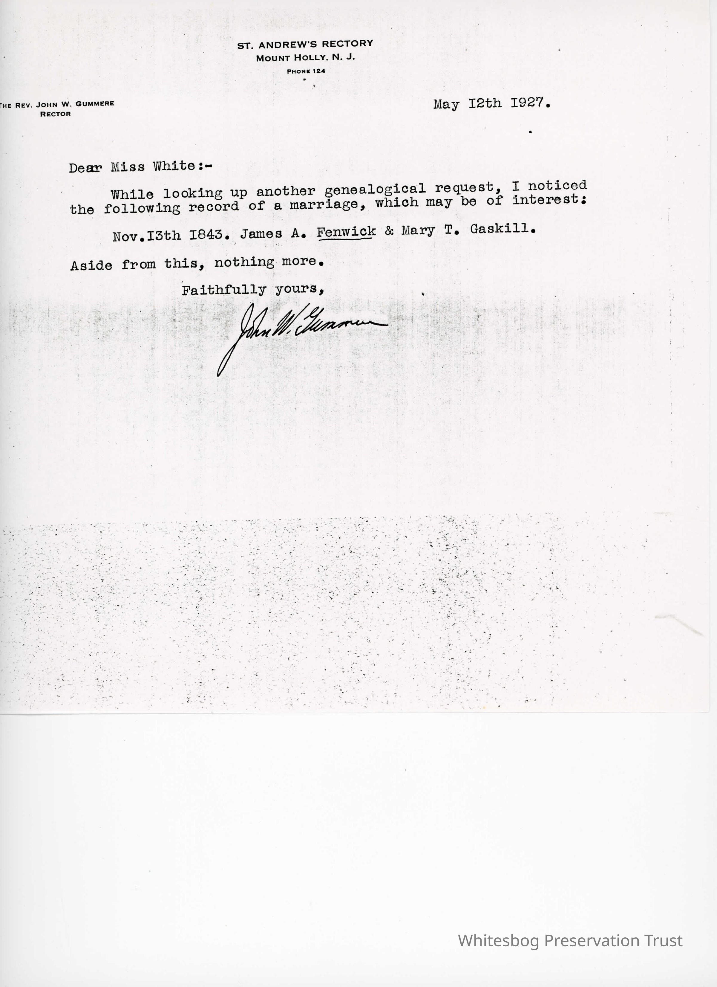 May 12, 1927: Reverend John W. Gummere writes to Elizabeth that he found in the church records the date of her grandparents marriage.