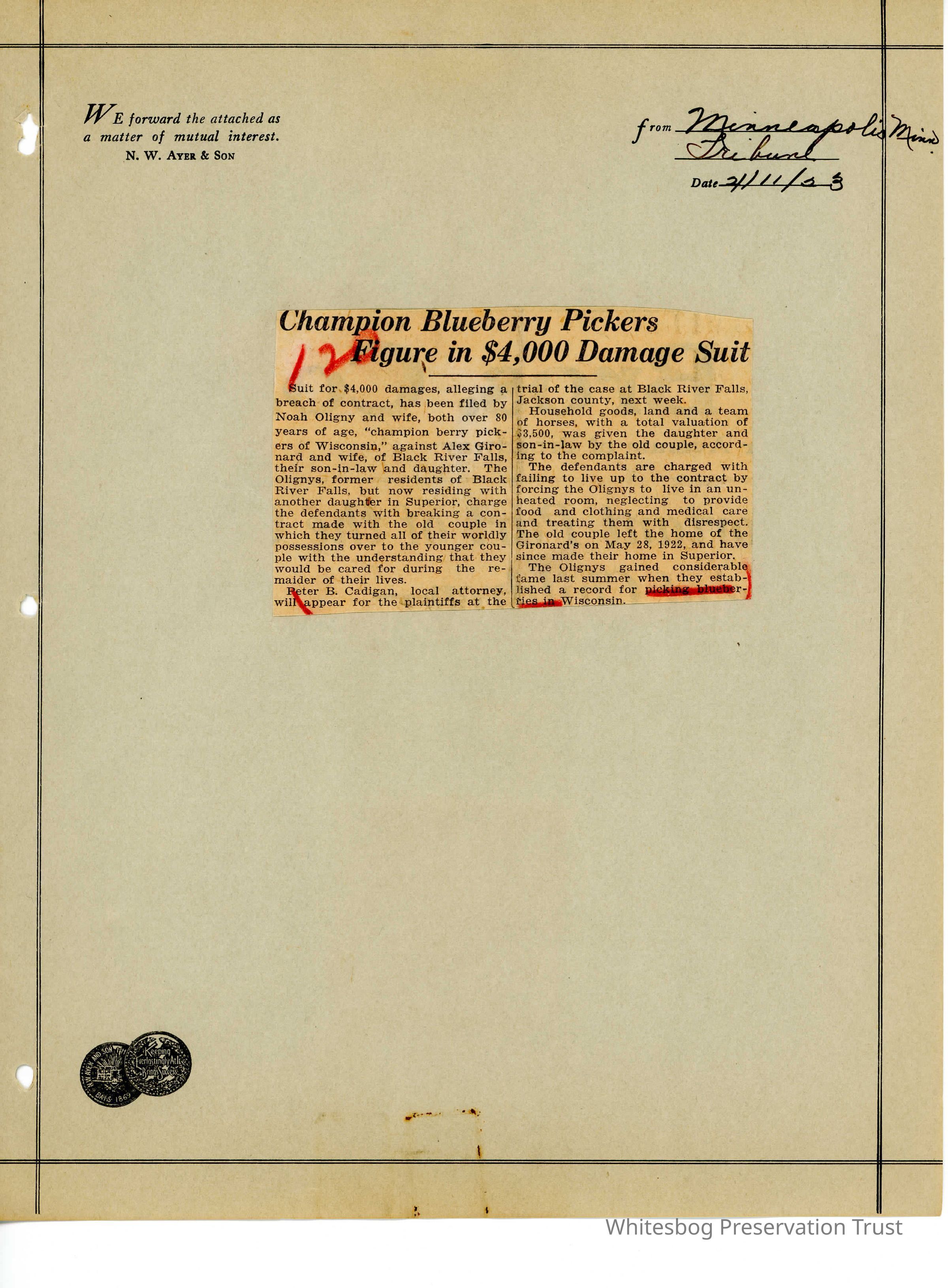 Champion blueberry picker of Wisconsin file suit alleging a breach of contract.