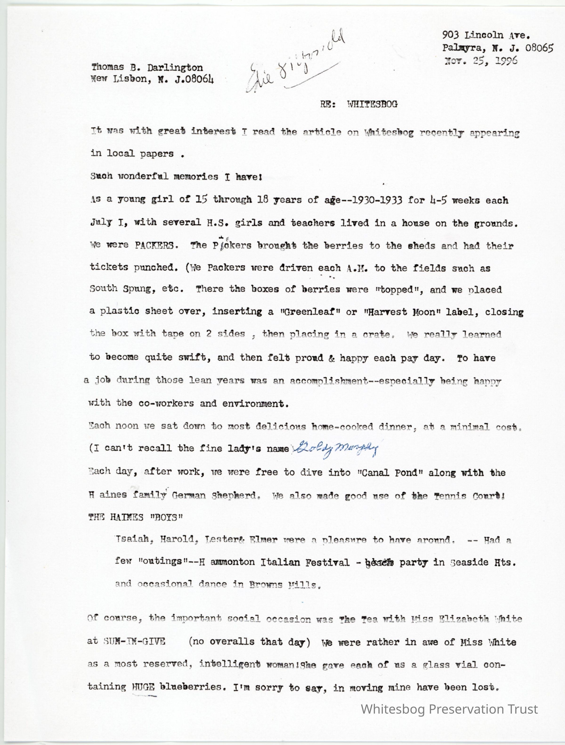 Letter from Edith King Barker to Tom Darlington, 11/25/1996