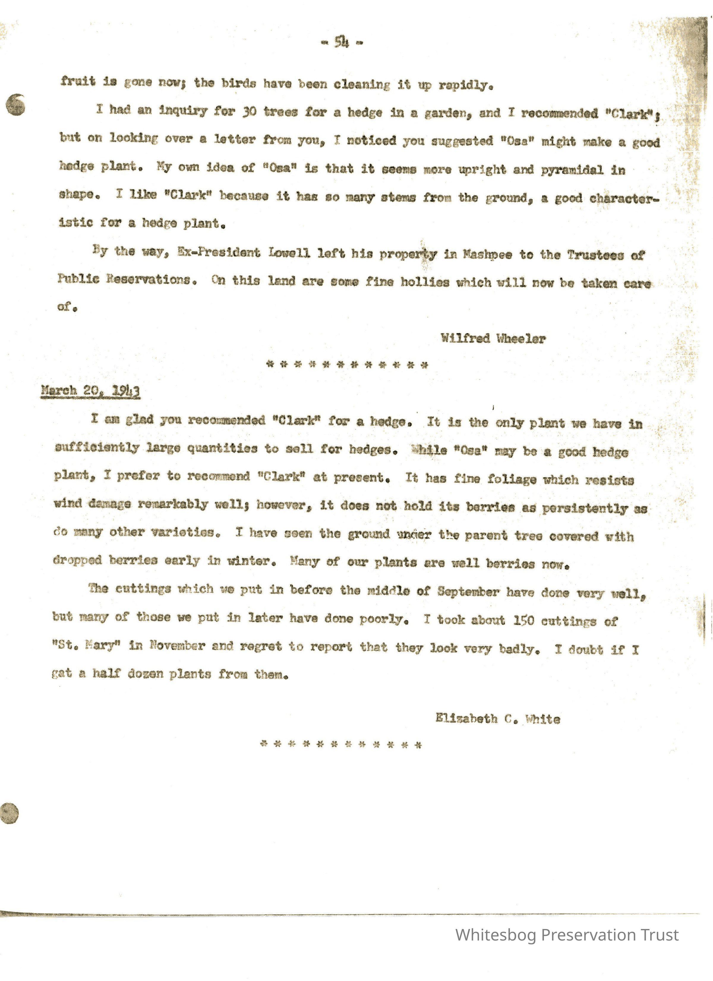 Eliz. White writes that she has spent the winter at Whitesbog; thought that perhaps they couldn't stay due to oil shortage but managed. Doing a tremendous business in blueberry plants. Thinks "Clark" is best for hedge- Holly ("St. Mary") cuttings put in in Sept. have not done well. Agrees that Dix is not as close to Whitesbog as Edwards is to Wheeler's farm.
