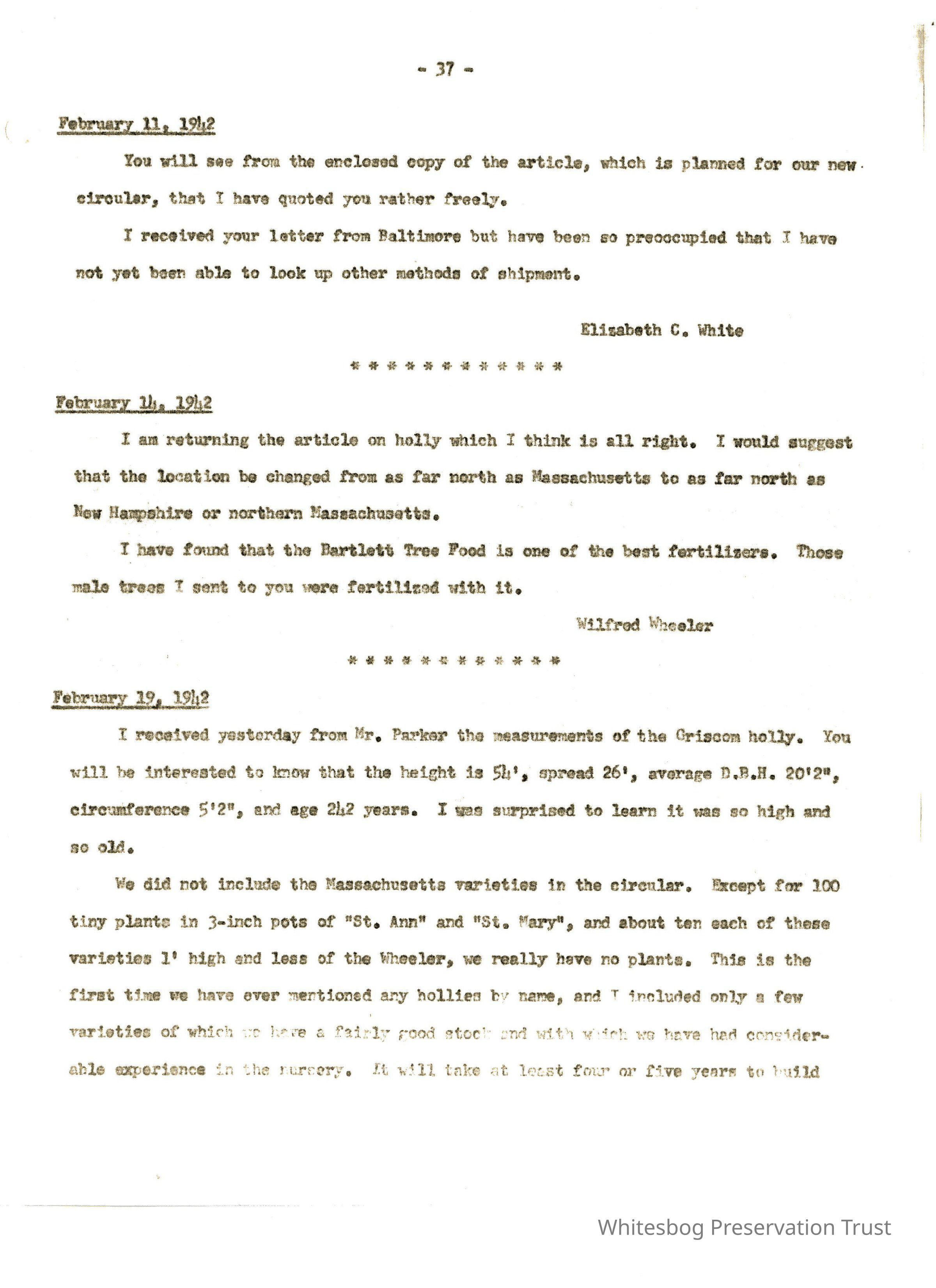 Elizabeth sends Wheeler a copy of the article on holly planned for Whitesbog's new nursery circular. She acknowledges quoting him "rather freely" and if she can use his name and Falmouth for his address. Wheeler agrees but suggest she say as far north as northern Mass. and NH, or a reader might think she meant just to the Mass. border. Also asks why she didn't include Mass. varieties and say he is collecting trees he found last fall,.