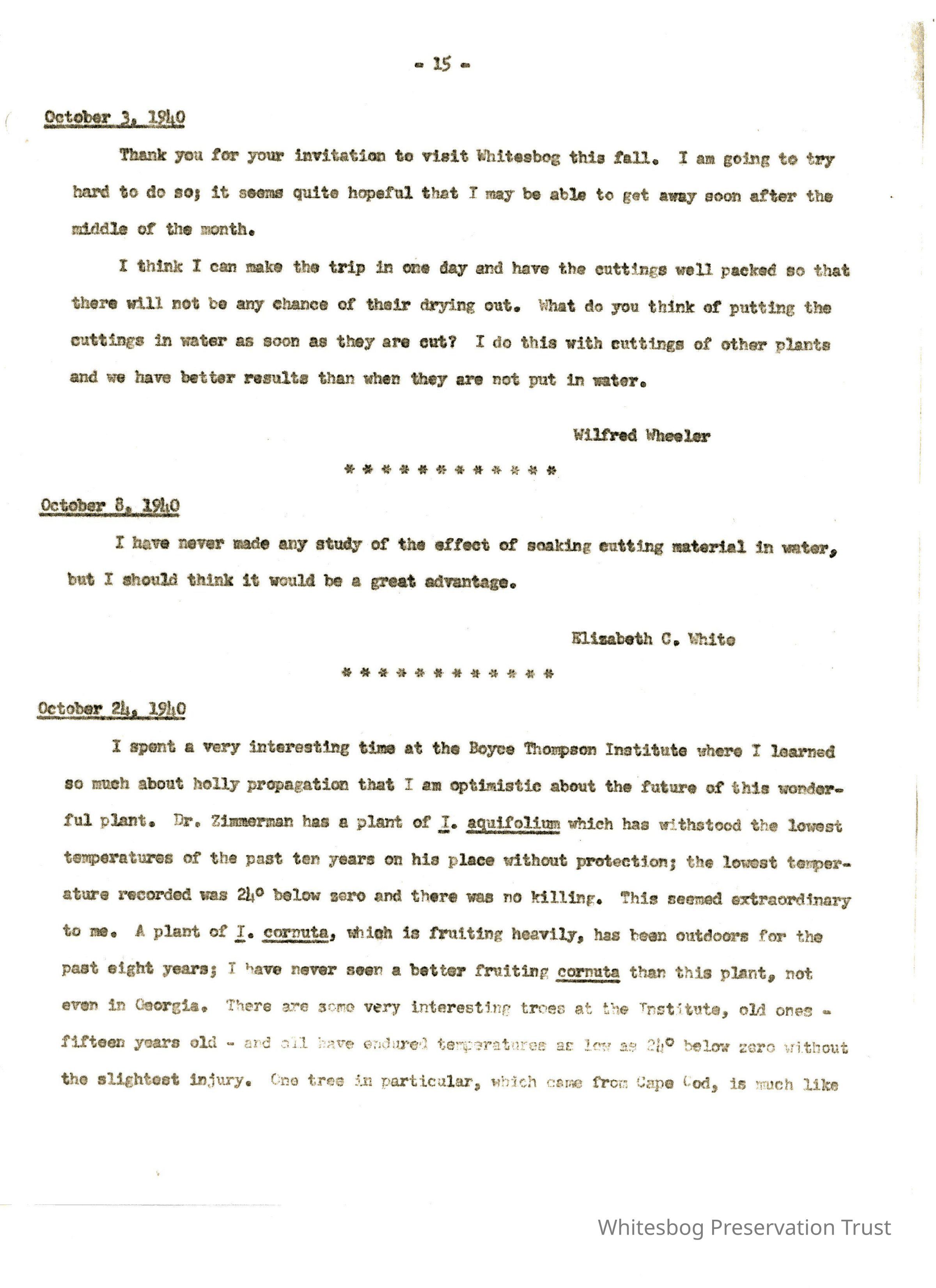 On Oct. 24, Wheeler writes to thank for his (and with Mrs. Wheeler) stay at Whitesbog and describes stopping at the Boyce Thompson Institute--optimistic about holly's future. In regard to Elizabeth's work with holly, Wheeler was much impressed with the Griscom tree. The 'Griscom' found near Woodbury, NJ, by EC White and Griscom and introduced about 1930 by White.Collection