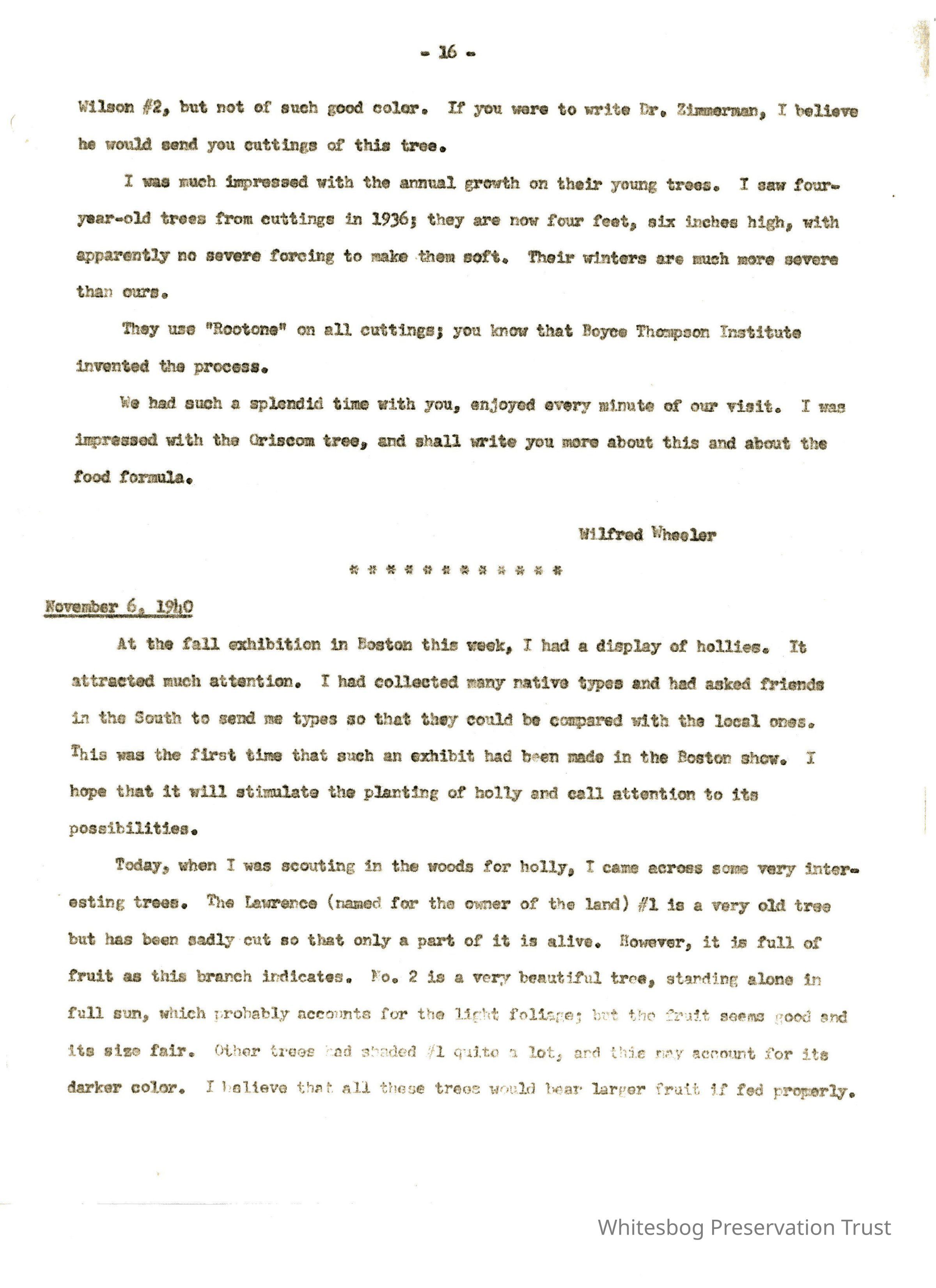 Most of the remaining content of these letters concerns a wild holly which Wheeler discovered. He proposes to send White about 1000 cuttings. Timing was discussed because of the cold weather as well as packing and shipping requirements. White is enthusiastic about the new specimen. Other topics include measures taken to insure the health of the original Grisom tree, a method of scoring the holly being done by the U.S.D.A., and the differences in hardiness between southern and northern hollies.