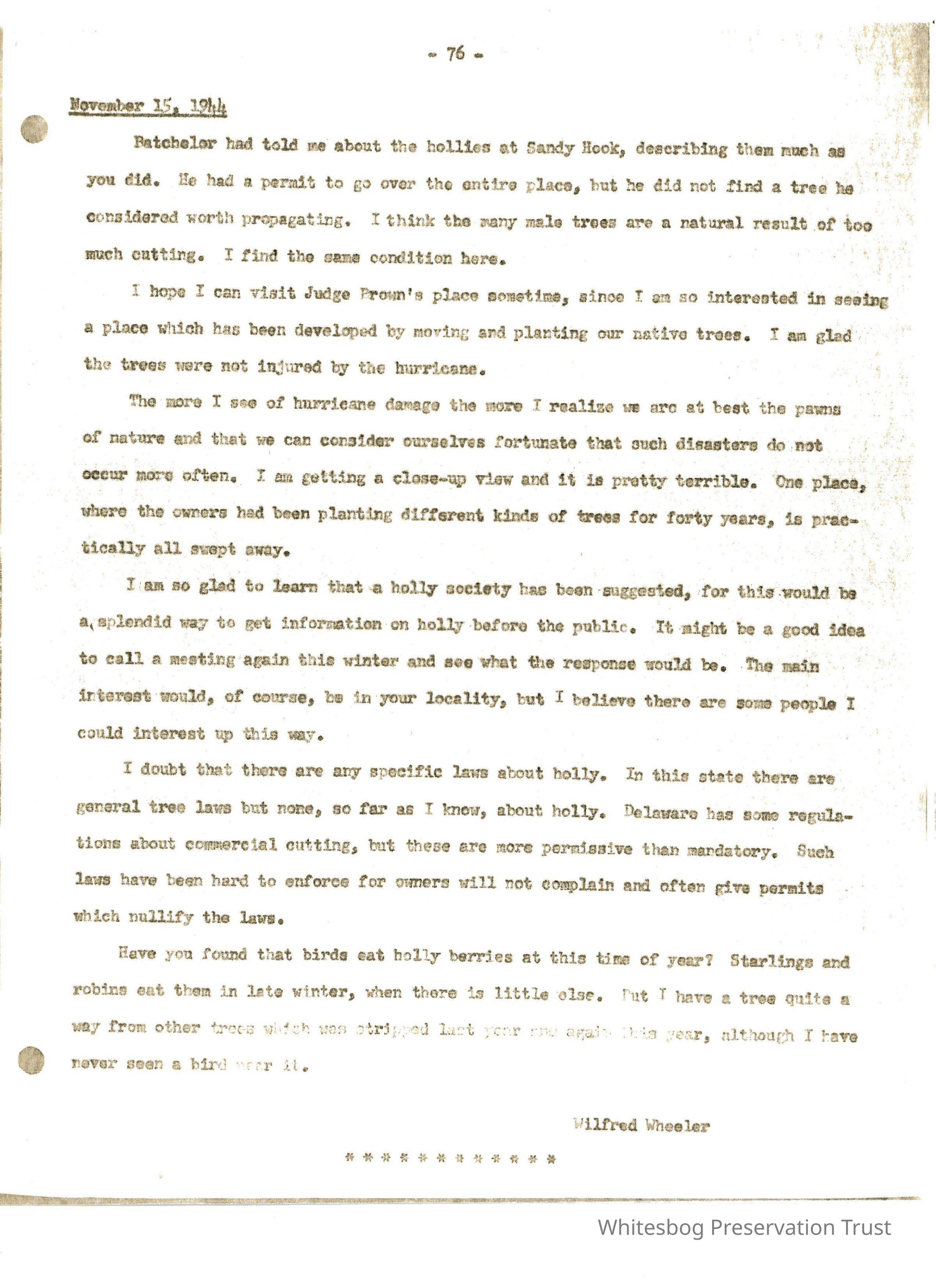 Wheeler describes Bachelor's past visit to Sandy Hook where he found nothing worth propagating. Hopes he can see Judge Brown's place one day. Again talks about how bad hurricane damage was for trees. Applauds the idea of a Holly Society. He doesn't think any states have laws for protecting holly. Hopes someone will do work in fertilization of holly. He would like to have kodachrome slides for his lectures. Asks if she feels that birds eat holly in November. Had a small exhibit at Boston Flower Show. Quite a lot of interest and orders for 6'-7' trees. One order for 12'-15' trees--might have to go to Dilatush.