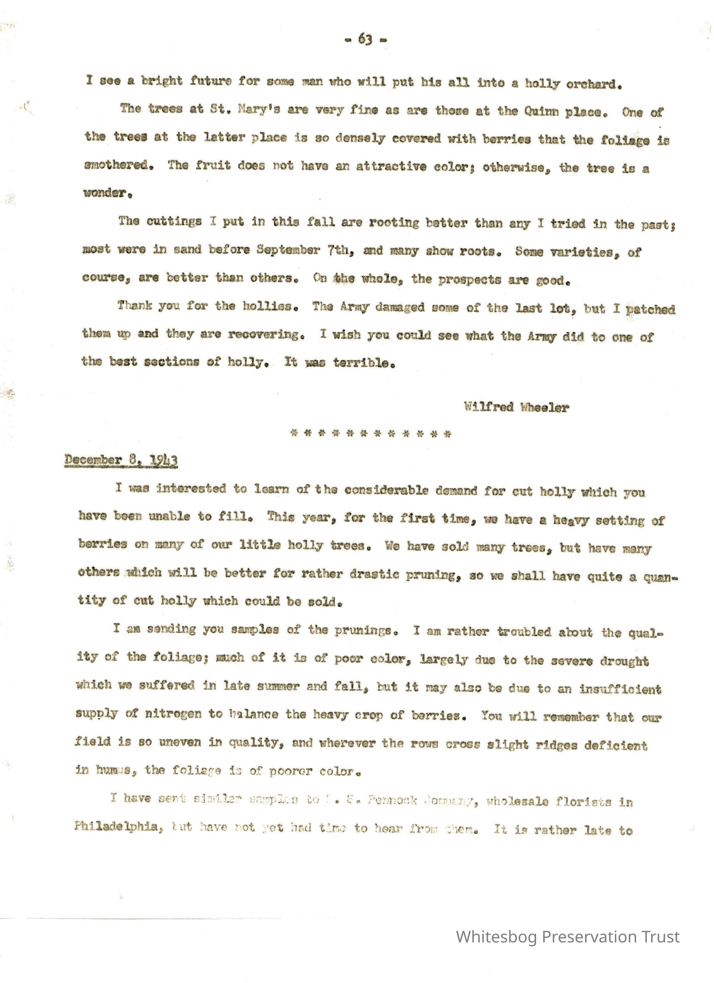 Dec. 8: White expresses interest in Christmas demand for cut holly. Has contacted S. Pennock florists in Philadelphia. Describes a visit she had had from S.L. O' Rourke of Beltville Station. Claims the Howard tree, a Florida strain, is most beautiful ilex opaca. Has a complex theory of holly pollination--Elizabeth hopes he is wrong as it would make things much more difficult. Refers to Thanksgiving dinner and admits to "great skill as a cook".