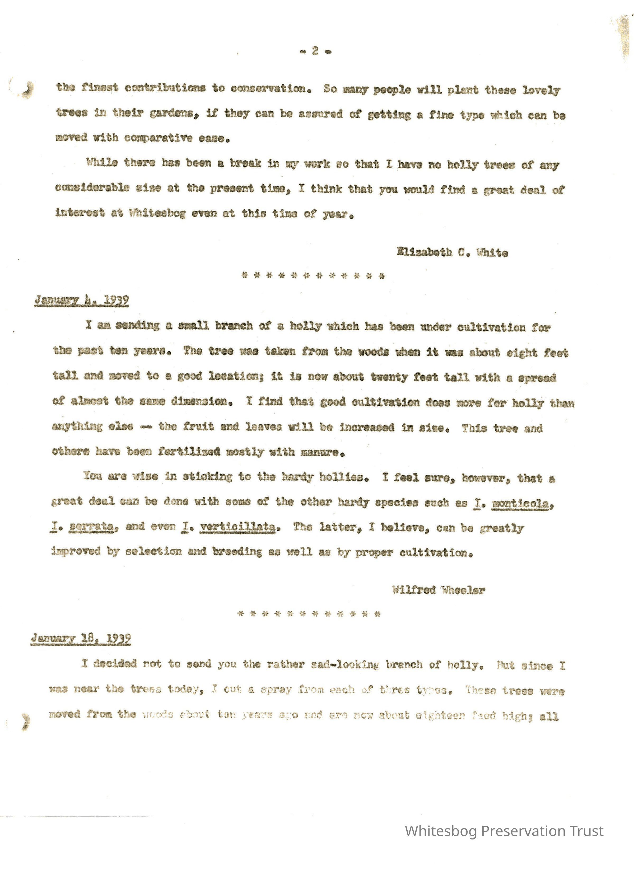 Wilfrid Wheeler sends Elizabeth White 3 cuttings. Elizabeth White asks for a price on a hundred or more cuttings from trees marked #1 and #2. She is interested in Mass. hollies since the other major holly grower is in Florida and she doesn't think those will do in the North.